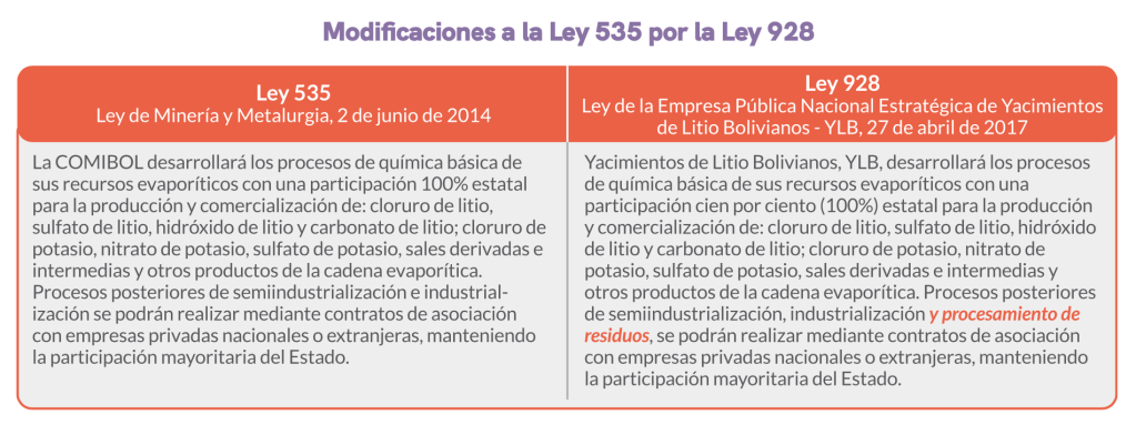 Sin embargo, a partir de 2017 hay una tendencia a flexibilizar la ley No 535 y permitir que “mediante contratos de asociación con empresas privadas nacionales o extranjeras” también se pueda producir carbonato de litio, hidróxido de litio y otros productos a partir del “procesamiento de residuos” que son básicamente salmueras residuales (Ley N°928, 2017). Esta flexibilización entorno a quién puede producir y comercializar productos de recursos evaporíticos fue realizada por el gobierno del MAS para permitir sociedades con empresas extranjeras como la alemana ACISA.