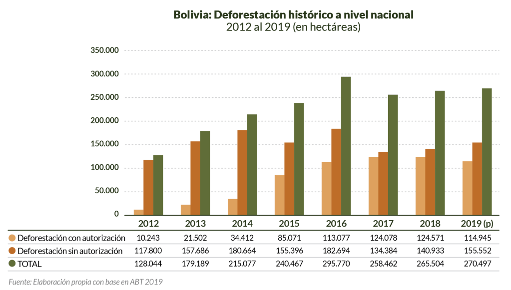 Sin embargo, esta situación no es nueva. La deforestación en el país ha tenido un índice de crecimiento constante durante los últimos años. De acuerdo a datos de la Autoridad de Fiscalización y Control Social de Bosques y Tierra (ABT), entre 2012 y 2019 en el país se deforestaron un total de 1,8 millones de ha, con un promedio de 231 mil ha deforestadas anualmente[5].