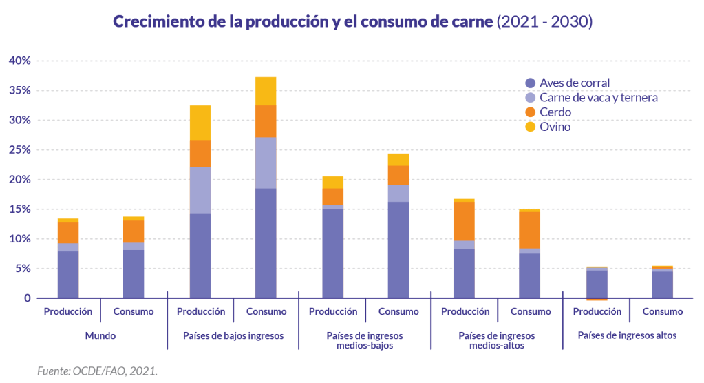 Según las proyecciones de la Organización de las Naciones Unidas para la Alimentación y la Agricultura (FAO), a nivel mundial se espera que para 2030 la producción de carne bovina se incremente y llegue al 20 % ocupando el tercer lugar en la producción mundial de carnes. El primer sitio está ocupado por las aves de corral, que en 2030 representará el 41 %; luego el cerdo con 34 %; y -detrás de la carne vacuna- estará la ovina con 5 % (OCDE/FAO, 2021). Sin embargo, sin ser la primera ni segunda carne más consumida actualmente, la carne bovina ha tenido los últimos años un crecimiento de demanda relevante sobre todo en el segmento de “países de bajos ingresos”. A continuación analizaremos estos aspectos.