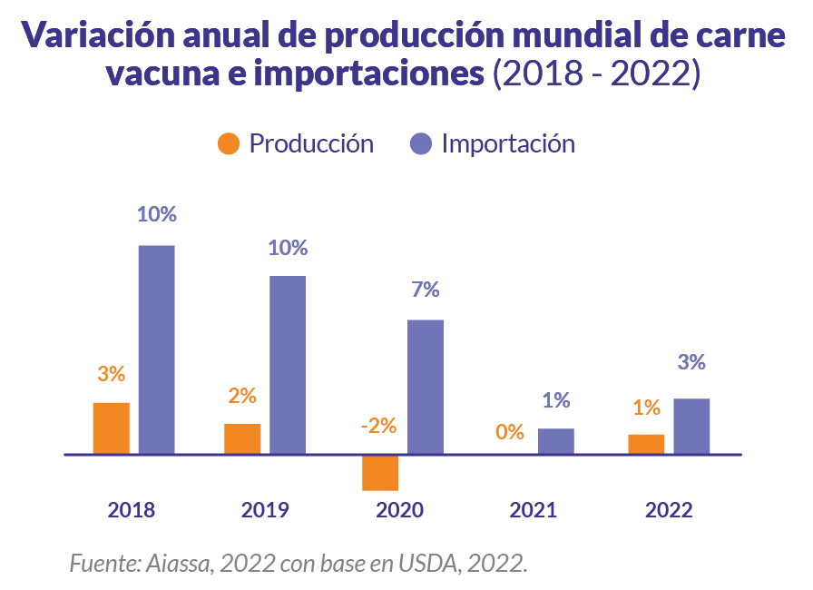 Los reportes del Departamento de Agricultura de Estados Unidos (USDA) sobre el comercio mundial de carnes prevén que en 2022 la demanda de carne bovina sea mayor que la oferta, como ha venido ocurriendo los últimos tres años. La importación prevista para este año llegará a 10 millones de toneladas, lo que representa un incremento de 2,7 % con relación a 2021; mientras la producción global de carne vacuna llegará a 58 millones de toneladas, lo que representa un crecimiento del 1 % respecto al año pasado (Aiassa, 2022).