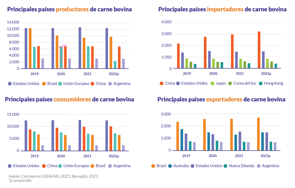 Para lograr su récord de exportación, Brasil incrementó levemente su producción unida a una caída en el consumo doméstico debido a los altos precios y una política de Estado que les permitió exportar más con el argumento de la devaluación de la moneda nacional. Entre septiembre a diciembre China detuvo las importaciones por dos casos de vaca loca, por lo que este año se prevé que este país podría exportar unas 400 mil toneladas más que en 2021 (USDA, 2021).