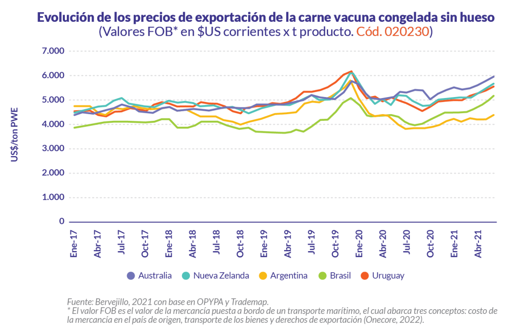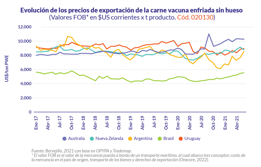 El precio medio de exportación difiere de acuerdo al país de origen y destino del tipo de producto. En el caso de la carne vacuna, los tipos de carne que se comercializan son: carne congelada y carne enfriada, siendo esta última la que tiene precios más altos. Brasil -que es el primer exportador- también es el país que tiene los precios más bajos del mercado para la carne enfriada entre 4.000 a 6.000 $US/t y es el país que más vende este tipo de carne al Mercosur (Mercado Común del Sur) y Chile; mientras el resto de los países han estado en el rango de 8.000 a 10.000 $US/t. Según Bervejillo (2021), los otros países especializados en carne enfriada son Australia, Uruguay y Argentina.