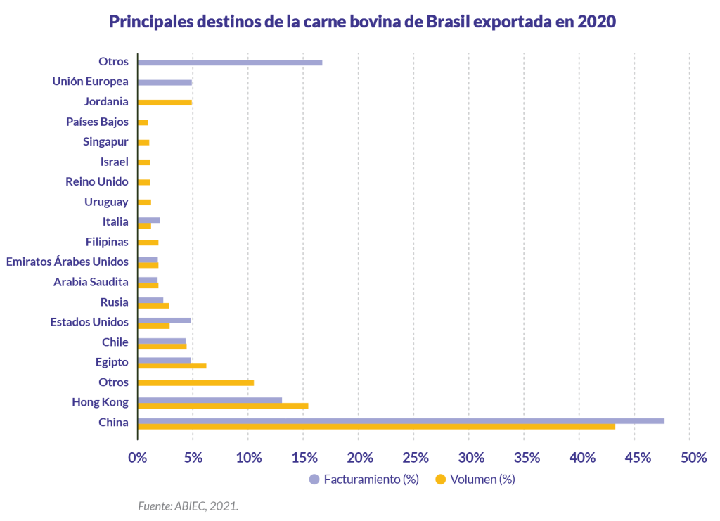La Asociación Brasileña de Industrias Exportadoras de Carne (ABIEC, 2021) indica que en 2020 se derribaron 41,5 millones de cabezas y registró un aumento del 8 % en las exportaciones de carne vacuna. El incremento se debe fundamentalmente al número de países de destino que pasó de 154 a 157, pero por sobre todo al aumento del volumen de carne a mercados como China, cuyo volumen exportado aumentó un 127 % entre 2019 y 2020.
