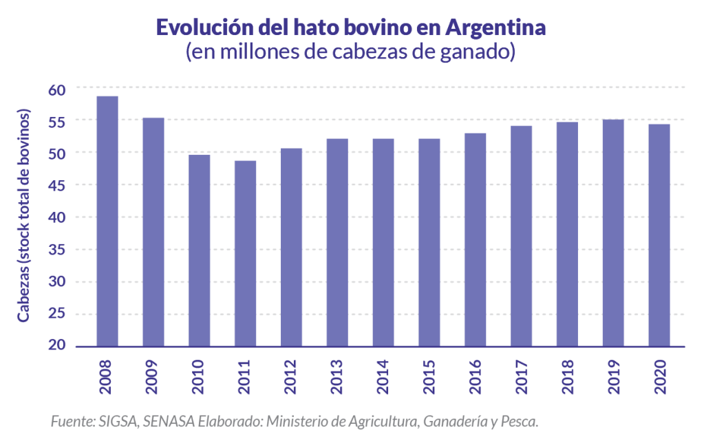 Argentina tiene un hato de 53.517.534 millones de cabezas (Senasa, 2020). La región tradicional ganadera concentraba el 80 % del rebaño y abarcaba: Buenos Aires (38,2 %), Santa Fe (11,5 %), Córdoba (8,7 %), Corrientes (8,5 %) y Entre Ríos (8,4 %), donde se encontraba la más alta concentración de hato con 600 mil a 1.100.000 cabezas en algunos municipios. Actualmente el Ministerio de Economía (2021) estima que apenas el 65 % del stock bovino argentino sigue en esa zona, desplazándose la actividad hacia áreas sin tradición ganadera como La Pampa (5,8 %) y Chaco (4,3 %), además de otros departamentos que poseen menos del 3 % del rebaño cada uno. Datos de la Comisión de Defensa de la Competencia sostienen que Argentina contaba con alrededor de 205.000 establecimientos ganaderos hasta 2016.