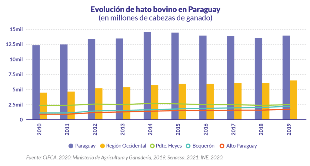 La expansión de la ganadería en el Chaco es un nuevo fenómeno, ya que tradicionalmente la ganadería estaba concentrada en la región oriental con el 63,2 % (Concepción, San Pedro, Cordillera, Guairá, Caaguazú, Caazapá, Itapúa, Misiones, Paraguarí, Alto Paraná, Central, Ñeembucú, Amambay, Canindeyú) y la región occidental albergaba al 36,8 % del hato; sin embargo, actualmente la región oriental cuenta con el 52,43 % de ganado y la región occidental del país con el 47,5 % (Pte. Hayes, Alto Paraguay y Boquerón). A nivel nacional se cuenta con 103.946 establecimientos ganaderos y 137.610 propietarios de ganado (Senacsa, 2020). El consumo per cápita de carne vacuna en Paraguay oscila entre 26 a 32 kilos, de acuerdo a diferentes fuentes (SEPPY, 2020; Frigomas, 2019; USDA, 2017), ocupando el tercer lugar luego de Argentina y Uruguay.