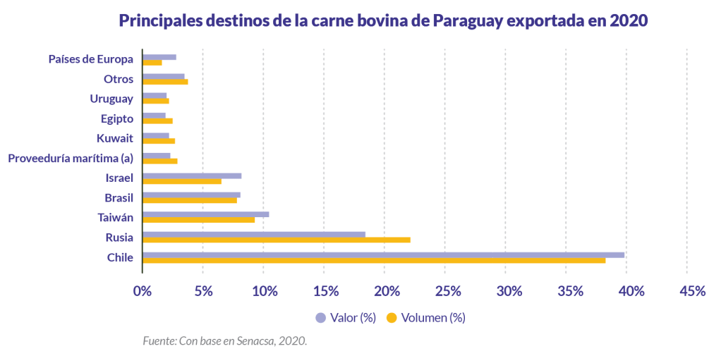En 2021 Servicio Nacional de Calidad y Salud Animal (Senacsa) anunció como “récord histórico” la exportación de más de 326.700 toneladas de carne bovina paraguaya a 47 países. Actualmente los principales mercados que adquieren esta carne son: Chile (38,25 %); Rusia (22,17 %), Taiwán (9,34 %), Brasil (7,82 %) e Israel (6,52 %). El resto de países adquiere menos del tres por ciento, incluyendo los países europeos: España, Alemania, Países Bajos, Italia, Suiza, Reino Unido y Portugal que en conjunto representan el 1,61 % del producto exportado. Hasta la fecha Paraguay no exporta carne a China continental, aunque la ARP -que agrupa a empresarios ganaderos- ha demandado iniciar las gestiones para exportar a China, Estados Unidos, Japón y Corea del Sur, Canadá y México.