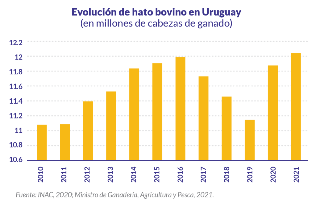 Uruguay posee un inventario bovino de 12.045.433 millones de cabezas de ganado, según el Servicio Nacional de Información de Ganado (SNIG, 2021) y el Ministerio de Ganadería, Agricultura y Pesca (MGAP, 2022). El país tuvo un comportamiento de debacle de la actividad que tuvo su punto más bajo en 2019, según los reportes históricos del Instituto Nacional de la Carne (INAC, 2020); en parte, al igual que Paraguay, podría deberse al déficit hídrico que padecen cinco departamentos del país. A fines del año pasado la sequía había afectado a 2.195.380 hectáreas y 623 establecimientos familiares ganaderos que poseen 79.967 ha (MGAP, 2022).