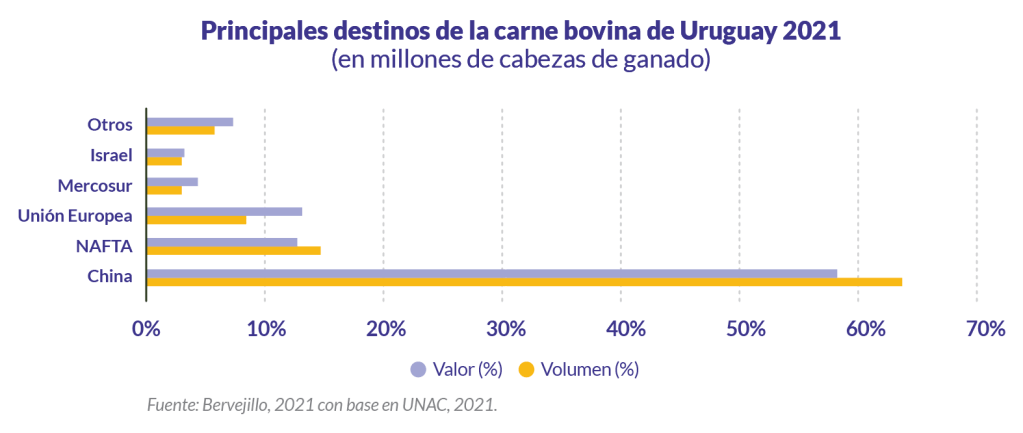 En 2021, las exportaciones de carne bovina totalizaron casi 560 mil toneladas equivalente carcasa (TEC), lo que representa un incremento del 14% respecto a 2019 y 2020, esto hizo que Uruguay alcance el récord histórico de 2.747 millones de dólares. Este incremento se debe en gran parte a las exportaciones a China, que aumentaron en un 70 % en ese mismo periodo llegando a representar el 63,69 % del total exportado; por el contrario, sostiene Bervejillo (2021), las exportaciones en el marco del NAFTA (Tratado de Libre Comercio de América del Norte) cayeron 12 %: Estados Unidos 13,76 %; Canadá 1,46 %; México 0,04 %. La Unión Europea consume el 8,7 % de la producción uruguaya (Países Bajos 8,23 %; Alemania 2,65 %; Italia 1,46 %; Reino Unido 1,20 %; Dinamarca 0,46 %; Portugal 0,18 %; Otros 0,49 %) y el Mercosur representa el 3,35 % (Brasil 3,12 %; Chile 0,75 %) (INAC, 2020).