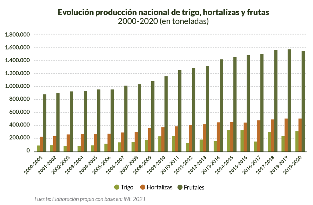 [3] Sin embargo, según los datos del Instituto Nacional de Estadística (INE), en 2020 se importaron aproximadamente 479.815 toneladas de trigo: 114.560 toneladas de trigo duro, 364.129 toneladas de harina de trigo y 1.126 toneladas otros derivados de trigo Véase: Nandina 1001, 1101, 110311, 110811, 110900, 190430 y 230203