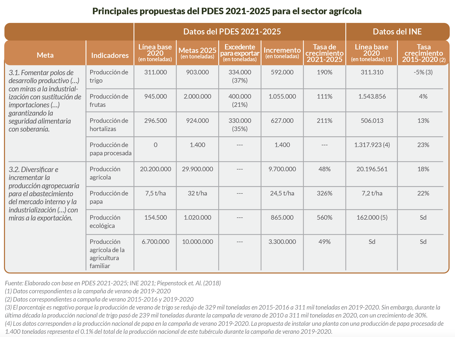 Sin duda, el punto más sobresaliente de esta propuesta es la producción del trigo. El PDES parte de una línea base de 311 mil toneladas de producción nacional de trigo en 2020, la cual representaría el 51% de la demanda interna de este cereal, y plantea aumentar esta producción a 903 mil toneladas; es decir, 592 mil toneladas más para 2025, lo que es igual a un crecimiento de 190%. Según el PDES, aumentar la producción de trigo a 903 mil toneladas representaría sustituir el 100% de las importaciones de trigo, llegando incluso a generar un excedente de 37% (334 mil toneladas) para la exportación.