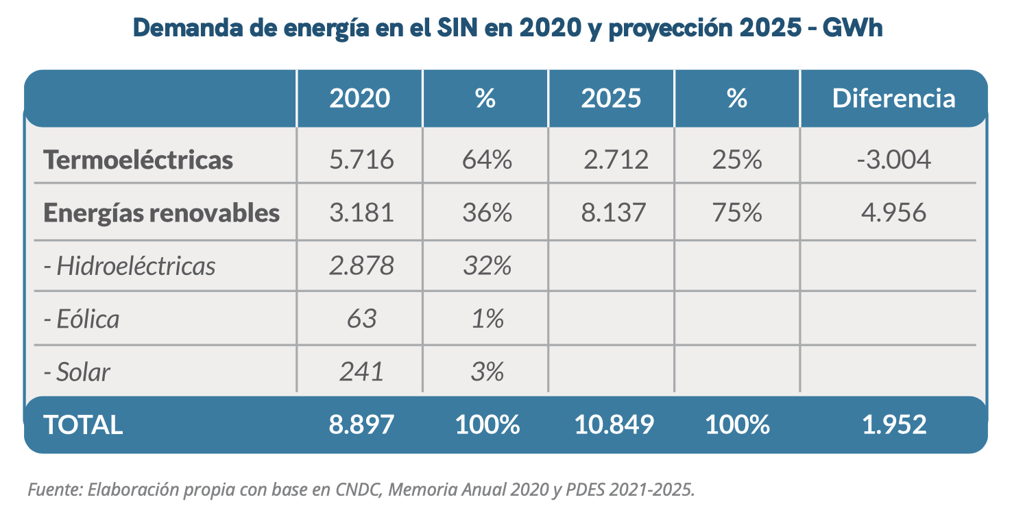 La meta 4.3.1 plantea subir la participación de las energías renovables (hidroeléctrica, eólica solar, biomasa y geotérmica) de 37 % en 2020 a 75 % para 2025. La producción de energía en el Sistema Interconectado Nacional (SIN) fue en 2020 de 8.897 GWh de los cuales 3.181 GWh (36 %) correspondieron a energías renovables y 5.716 GWh (64 %) a termoeléctricas [1]. La proyección del Comité Nacional de Despacho de Carga es que para el 2025 la demanda será de 10.849 GWh. Lo que significa que para alcanzar la meta del PDES, en 2025 las energías renovables deben incrementar su producción a 8.137 GWh (75 %) y disminuir el aporte de las termoeléctricas a 2.712 GWh (25 %) [2]. El PDES no señala cuáles serán las nuevas plantas de energías renovables (principalmente hidroeléctricas) que duplicarán la generación eléctrica de las energías renovables en los próximos tres años, ni aclara que pasará con las termoeléctricas que disminuirán en más de la mitad (3.004 GWh) su contribución al SIN para 2025 [3].