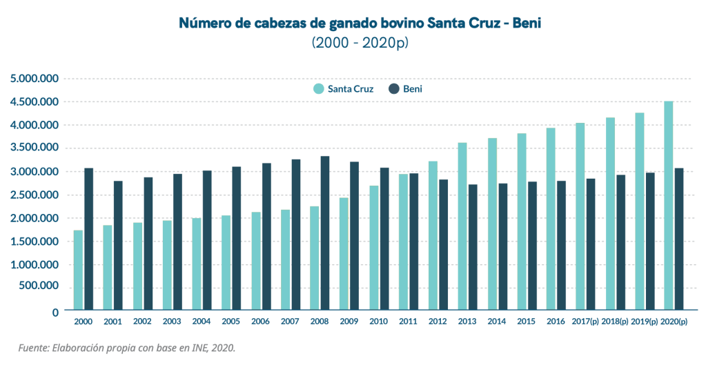 La meta 3.2.6 plantea pasar de 10,1 millones en 2020 a 18,3 millones cabeza de ganado bovino para 2025. Esto significa un incremento de 81 % en las cabezas de ganado. Para alcanzar dicha meta el hato ganadero debe crecer a casi 15 % por año, cifra que triplica la media de crecimiento anual de los últimos 20 años. El PDES no especifica en qué región y departamento se dará el incremento del hato bovino. Desde 2008 el departamento de Santa Cruz tiene un crecimiento sostenido, mientras Beni experimenta un decrecimiento con estancamiento de sus cabezas de ganado. Pretender casi duplicar el hato ganadero tendrá un grave impacto sobre las quemas y la deforestación en la Chiquitania, la Amazonía, el Pantanal y el Chaco.