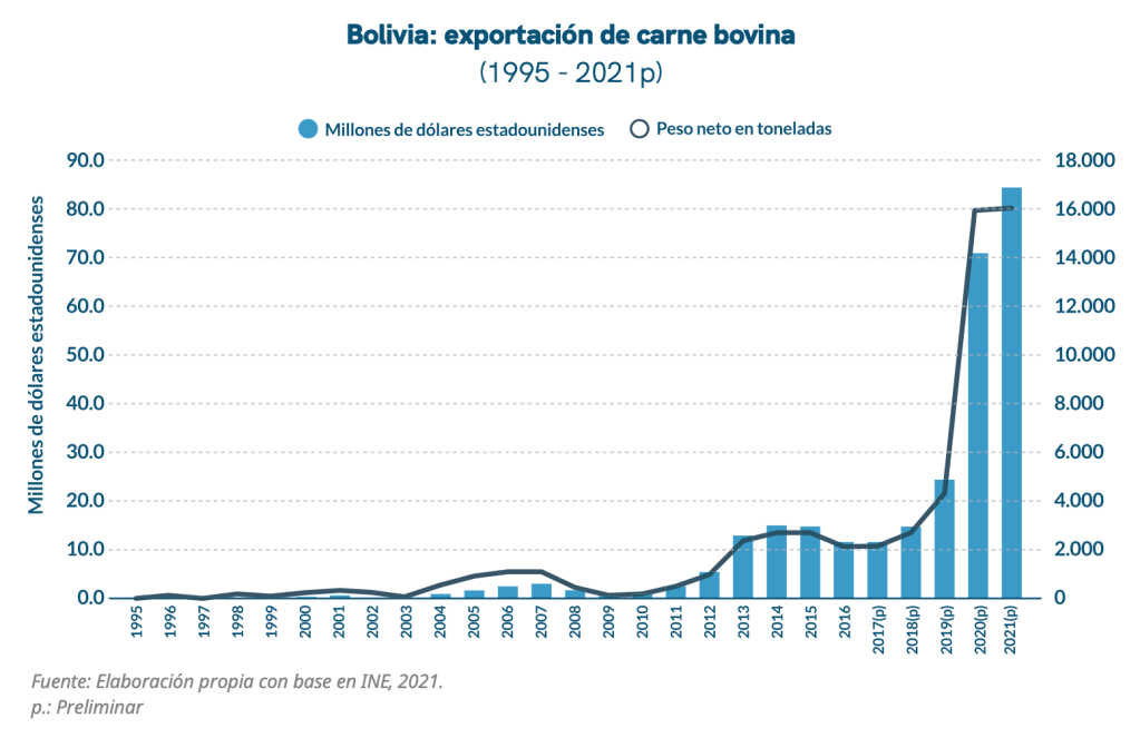 La meta 3.2.6 plantea pasar de una producción de 276,4 mil toneladas a 338,6 mil toneladas de carne bovina para 2025, lo que representa un incremento del 22 %, muy inferior al incremento en la cantidad proyectada de cabezas de ganado. Así mismo, el PDES propone duplicar la exportación de carne, pasando de 14.000 toneladas en 2020 a 30.000 toneladas para 2025. Esto implica que un cuarto del incremento en la producción de carne será destinado a la exportación, que ha empezado a dispararse en los últimos años, principalmente a China que representó el 84 % de las exportaciones en 2020.