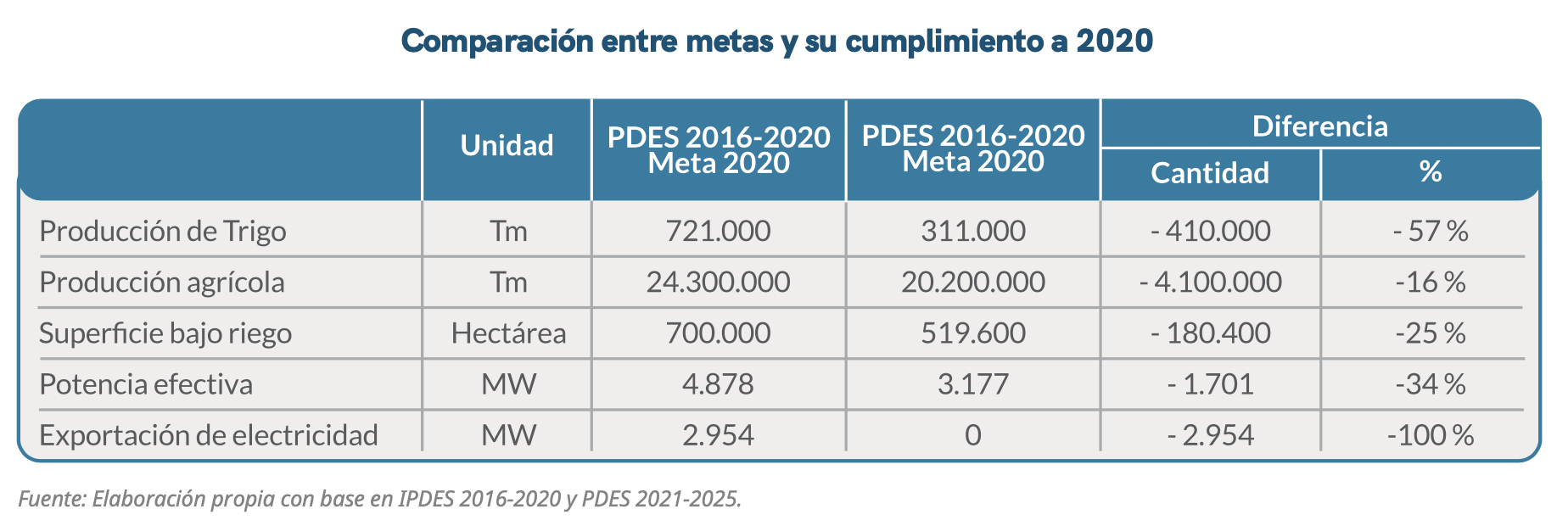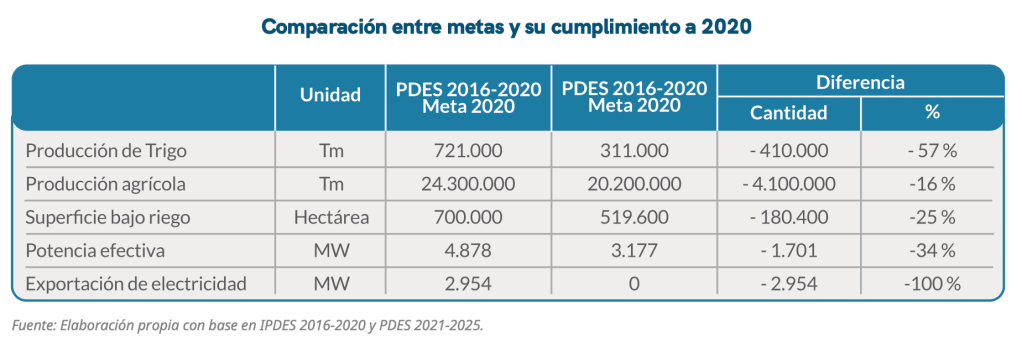 Otro tema a destacar en el PDES 2021-2025 es que no realiza una evaluación sobre el cumplimiento o no de las metas del PDES 2016-2020. En el diagnóstico que hace del anterior PDES, el nuevo PDES se limita a mostrar estadísticas del anterior quinquenio sin mencionar en ningún momento cuales eran las metas del anterior PDES ni hacer un análisis de su cumplimiento[1]. En la tabla adjunta hacemos una comparación entre algunas metas establecidas por el PDES 2016-2020 para 2020 y la línea base del año 2020 de la cual parte el PDES 2021-2025. La