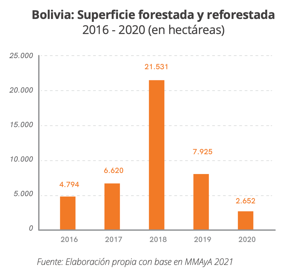 esta nueva meta reducida, el año pasado la forestación y reforestación debió aproximarse a 50.000 hectáreas. Es muy probable que al ritmo actual ni siquiera se alcance la forestación y reforestación de 500.000 hectáreas en el período 2021 y 2030.