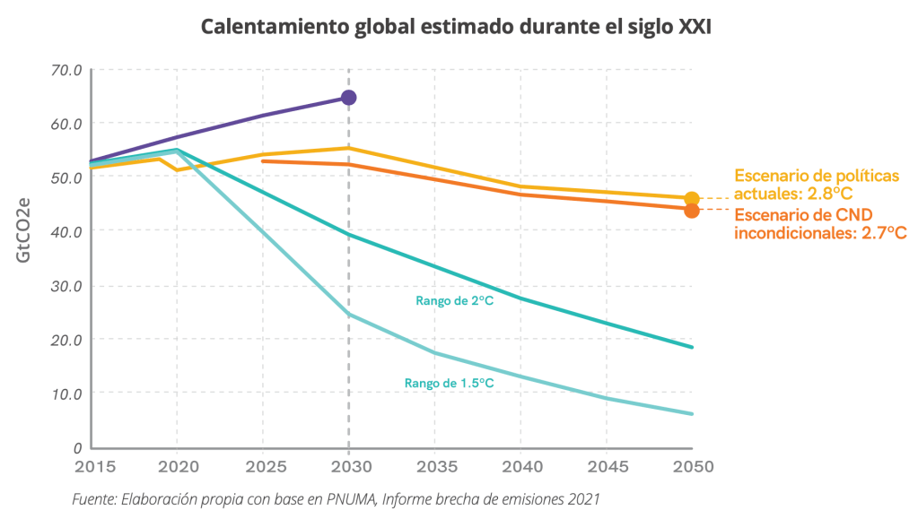 Según el reporte de la brecha de emisiones del Programa de las Naciones Unidas para el Medio Ambiente (PNUMA) del año 2021, para limitar el incremento de la temperatura a 2o C (grados centígrados) las emisiones mundiales de gases de efecto invernadero deben ser 39 gigatoneladas de dióxido de carbono equivalente (GtCO2e) para 2030. Sin embargo, serán 52 GtCO2e con las metas incondicionales que han presentado los países en sus segundas CND. En otras palabras, la brecha de emisiones para limitar el incremento de temperatura a 2o C es de 13 GtCO2e.
