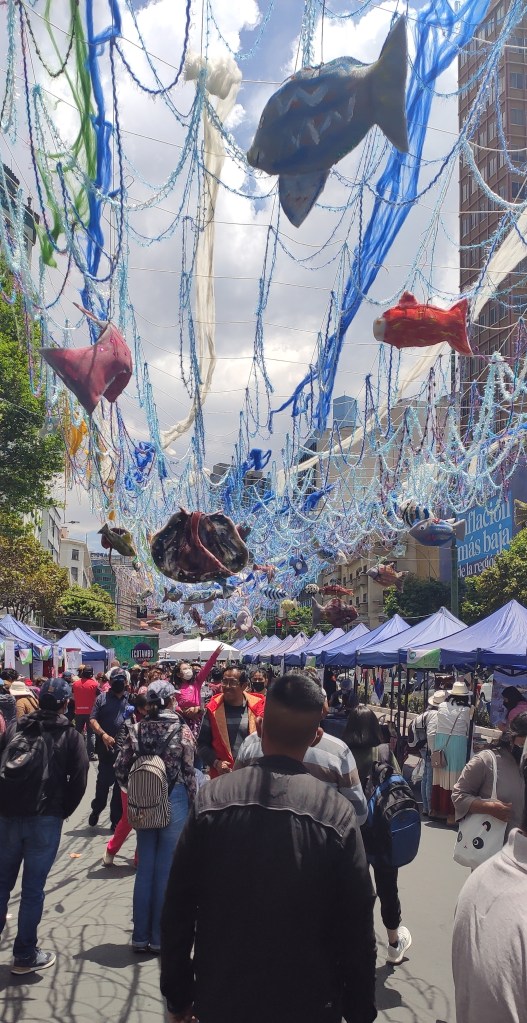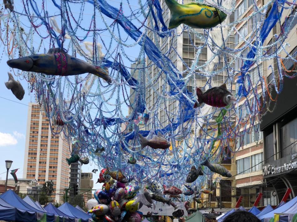 Las y los niños que pasaron por la feria quedaron embelesados por los peces que colgaban sobre ellos. Estos eran parte del río aéreo que, durante más de una semana, una decena de personas de la Fundación Solón construyeron para así concientizar sobre la importancia de los ríos y los bosques amazónicos.