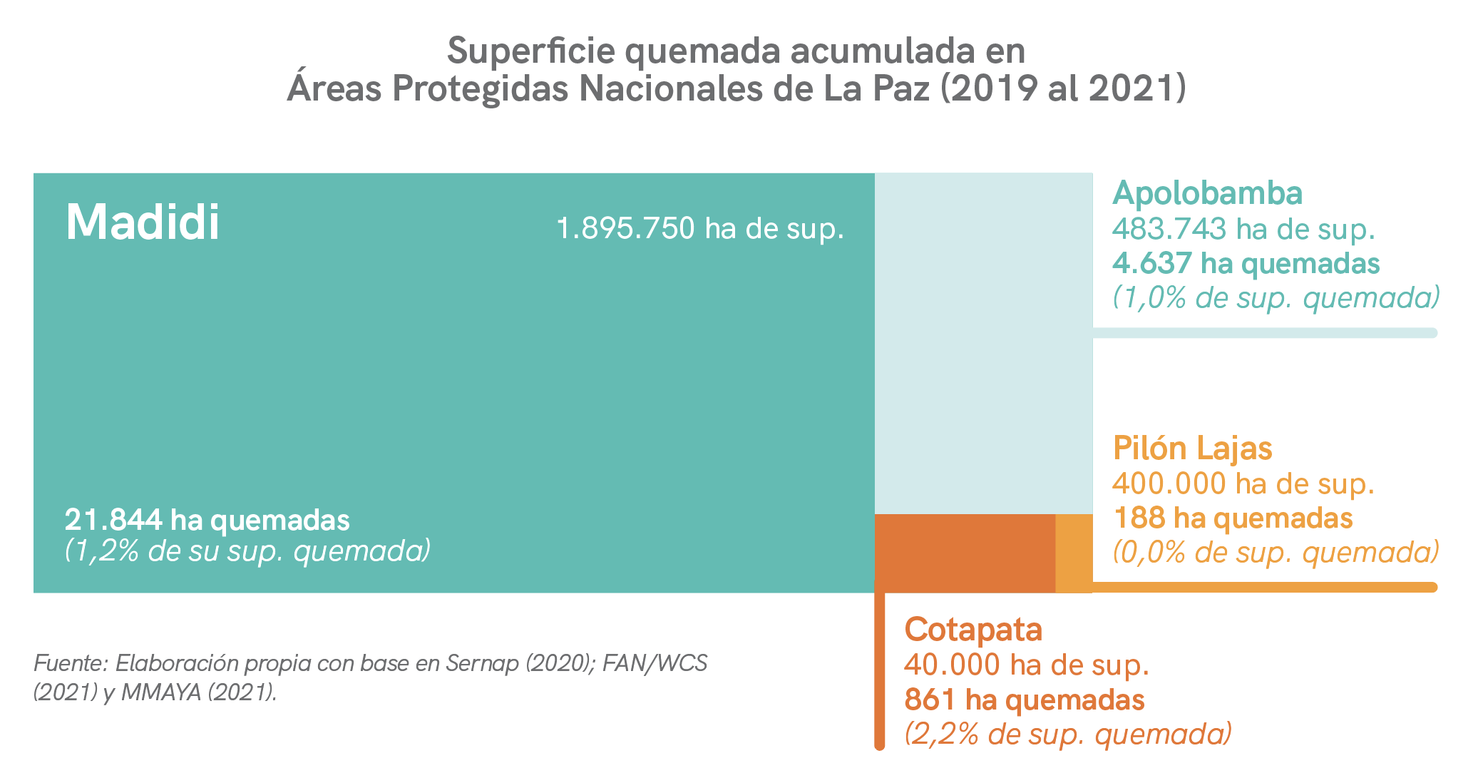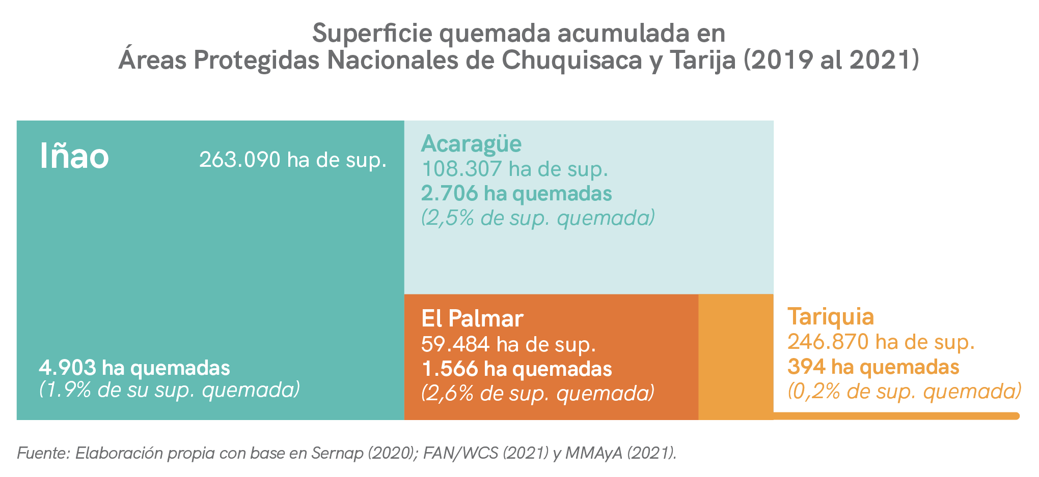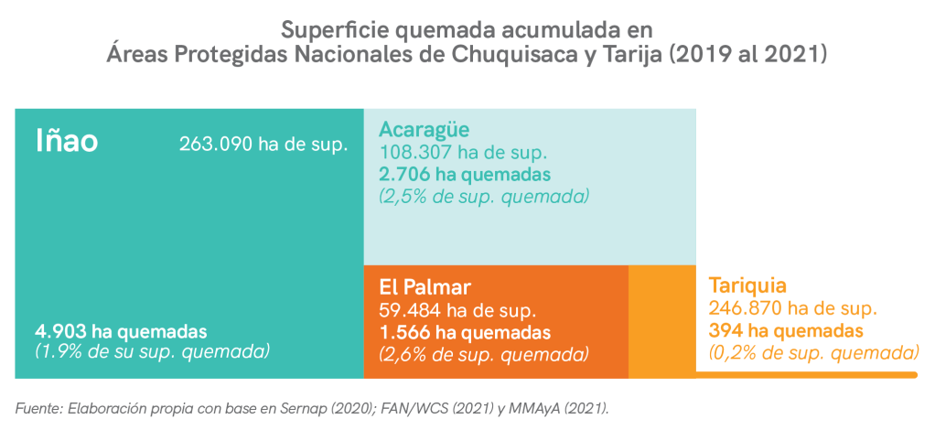 Por el otro lado, se encuentran las AP de Iñao y El Palmar en Chuquisaca y Aguaragüe en Tarija. Durante 2019 al 2021, el PN y ANMI Serranías del Iñao y el ANMI El Palmar registraron 4 mil y 2 mil ha quemadas. Esta área quemada representa respectivamente el 1,9% y el 2,5% del total de su superficie. Por otra parte, el PN y ANMI Aguaragüe registró 2 mil ha quemadas durante el mismo periodo, equivalente al 2,5% de la superficie total del AP.