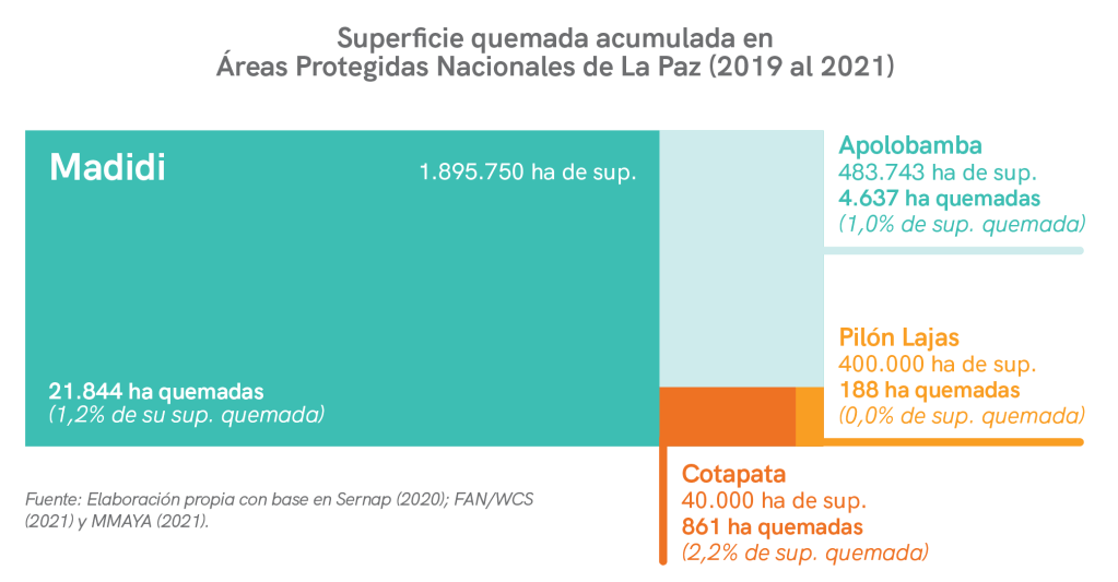 Después de San Matías, Otuquis y Noel Kempff Mercado, las AP nacionales que registran mayor superficie quemada acumulada entre 2019 y 2021 son: Territorio Indígena y Parque Nacional Isiboro Securé (TIPNIS), Madidi, Carrasco, Tunari, Iñao, Apolobamba, Aguaragüe, entre otras. Muchas de las cuales han registrado una mayor incidencia histórica de quemas durante las últimas dos décadas (Rodríguez, 2014; SIMB, 2022).