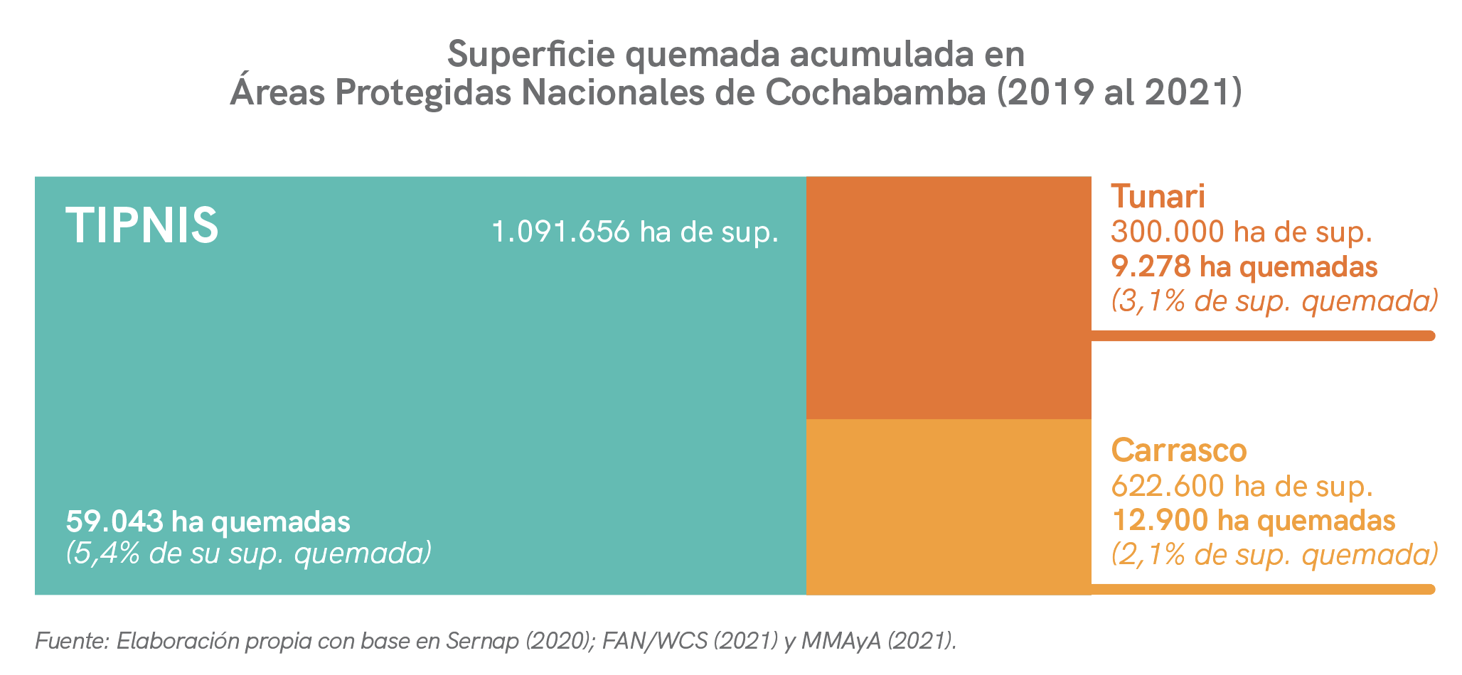 En el curso de los últimos tres años, el TIPNIS, el PN Carrasco y el PN Tunari en Cochabamba acumularon 59 mil, 12 mil y 9 mil ha quemadas respectivamente, ubicándose de esta manera dentro las diez primeras AP con mayor superficie quemada en el país. Estas tres AP poseen, asimismo, un porcentaje de quema en relación al total de su superficie entre las más elevadas. Durante las quemas de 2019 al 2021, en el TIPNIS se quemó el 5,3% de su superficie, en el Tunari el 3,1% y Carrasco el 2,1%.