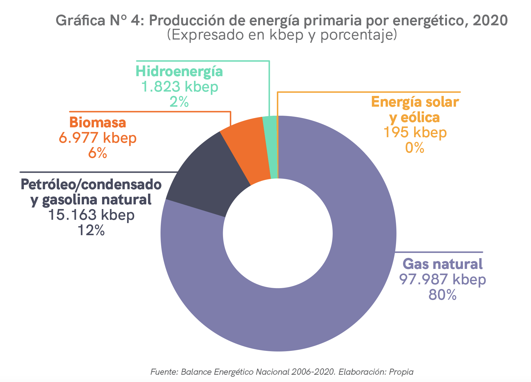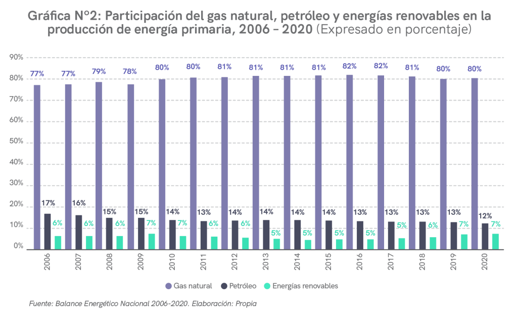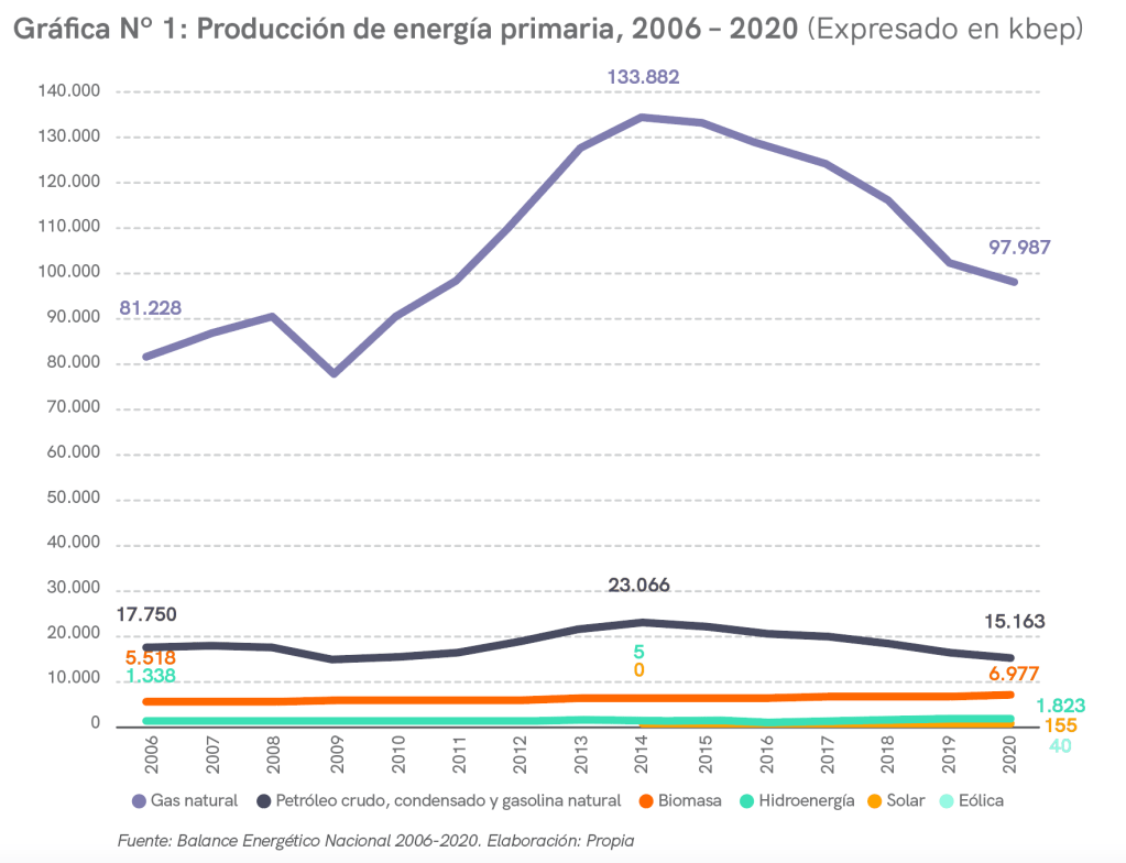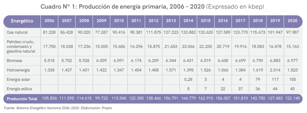 La producción de energía primaria[3] en el periodo 2006 – 2020, creció de 105.833 kbep el año 2006 a 164.779 kbep el año 2014, para luego ir en un decrecimiento de forma constante hasta llegar a los 122.145 kbep el 2020 (Cuadro y gráfica Nº 1). La producción de petróleo está asociada a la de gas natural y juntas han tenido una participación de entre el 93% y 95% de la producción total de energía primaria en este período (Gráfica Nº 2). El 2020 se produjo un 92,63% de petróleo y gas natural; mientras la energía eólica, solar, hidroeléctrica y biomasa apenas llegaron al 7,36%. Esto significa un fuerte dominio de los combustibles fósiles en la matriz energética primaria que no ha cambiado en los últimos 15 años (Gráfica Nº 2).