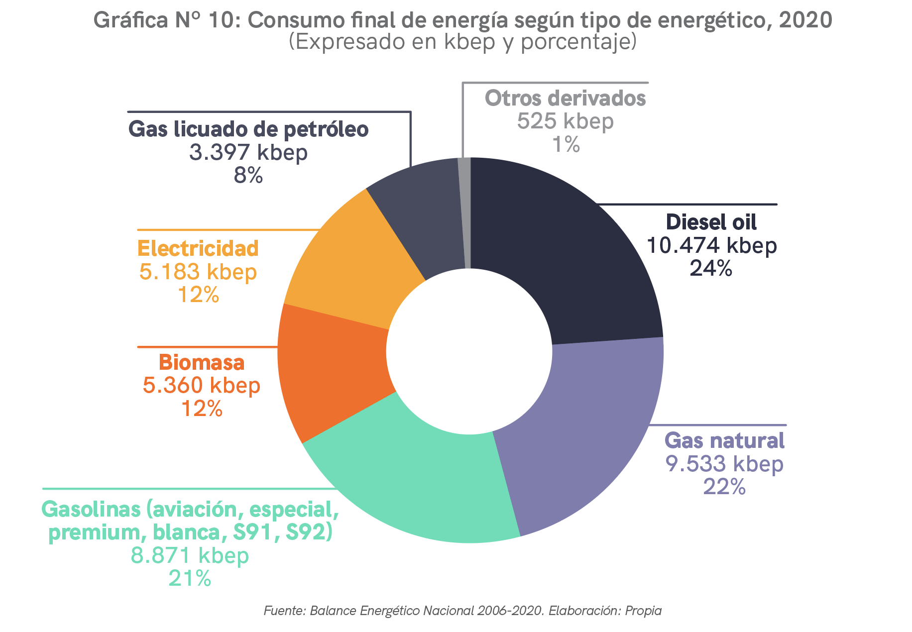 El 2020, los combustibles que se consumieron internamente fueron casi un 76% fósiles (gas natural, gasolinas, diesel oil, GLP), seguido de biomasa con más del 12% y la electricidad casi un 12% (Gráfica Nº 10).