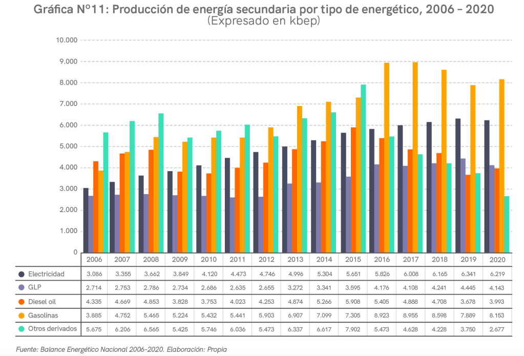 La carga de energía a los centros transformación, que incluye el diésel oil, creció de 24.6 mil kbep el año 2006 a 40.3 mil kbep el 2016 y disminuyó a 32.5 mil kbep el 2020 (Gráfica Nº 7).
