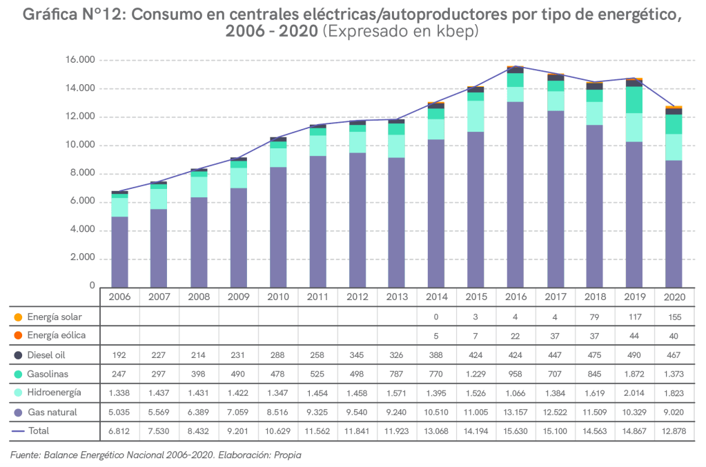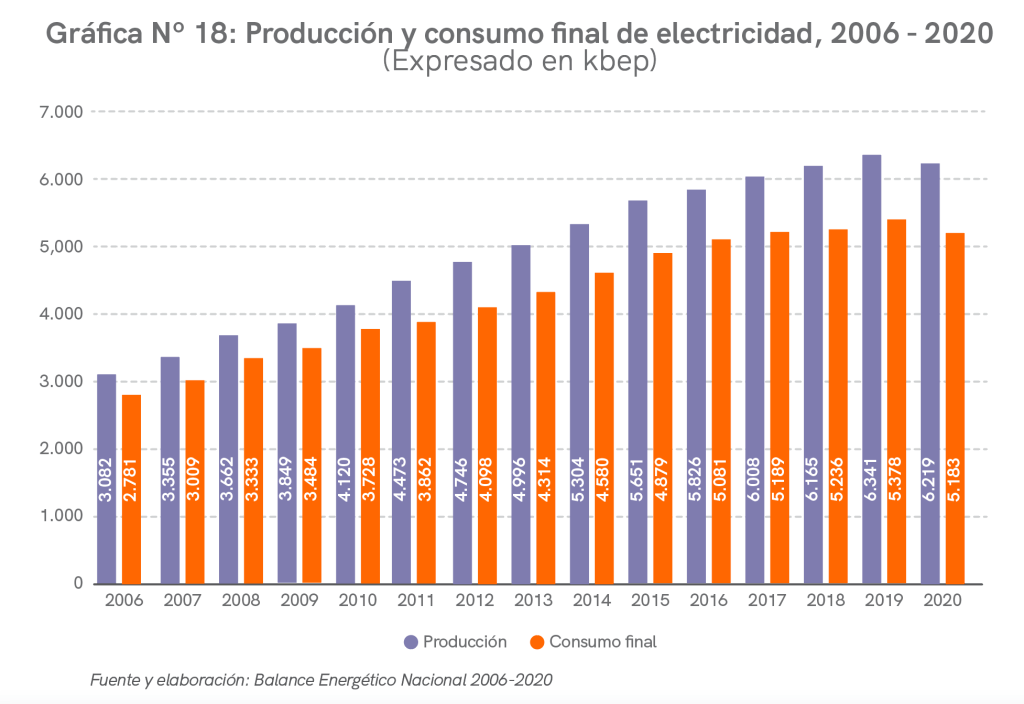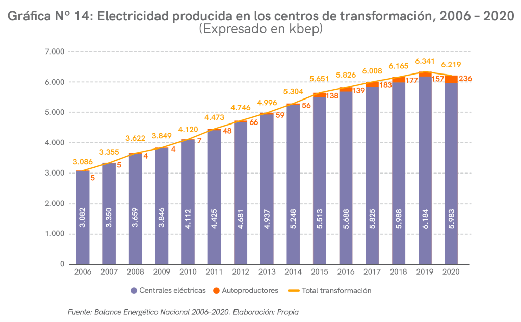 El 96% de la electricidad es producida por centrales eléctricas y el restante 4% por autoproductores. Entre 2006 y 2020 la producción de electricidad se duplicó pasando de 3 mil kbep a 6.2 mil kbep (Gráfica Nº 14).