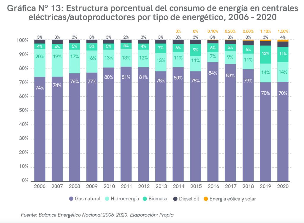 La generación termoeléctrica con turbinas de ciclo combinado es de mayor eficiencia y menores costos y empezó a funcionar desde el 2019, produciendo más de la mitad de la electricidad y desplazando a las centrales de ciclo simple. El consumo de gas natural por parte de las centrales eléctricas y autoproductores ha tenido una tendencia creciente entre el 2006 y el 2016, pasando de 5 mil kbep a más de 13 mil kbep en 2016, para descender 9 mil kbep el 2020 (Gráfica Nº 12). En términos porcentuales, el gas natural pasó de 74% hasta un pico de 84% de participación el 2016, para bajar hasta 70% en 2020. Por su parte las hidroeléctricas bajaron su participación porcentual de 20% a 7% en 2016 para situarse en 14% en 2020 (Gráfica Nº 13).