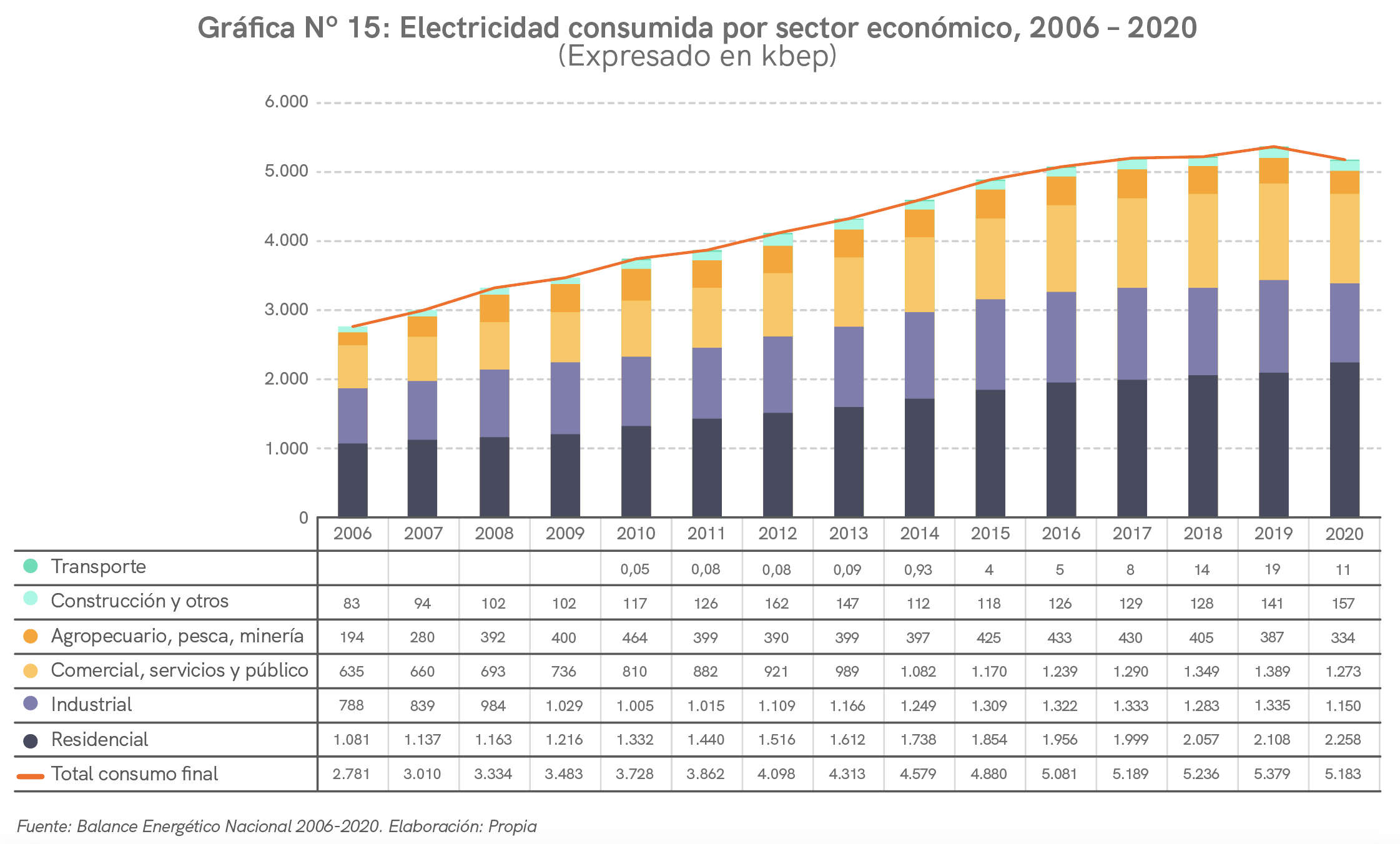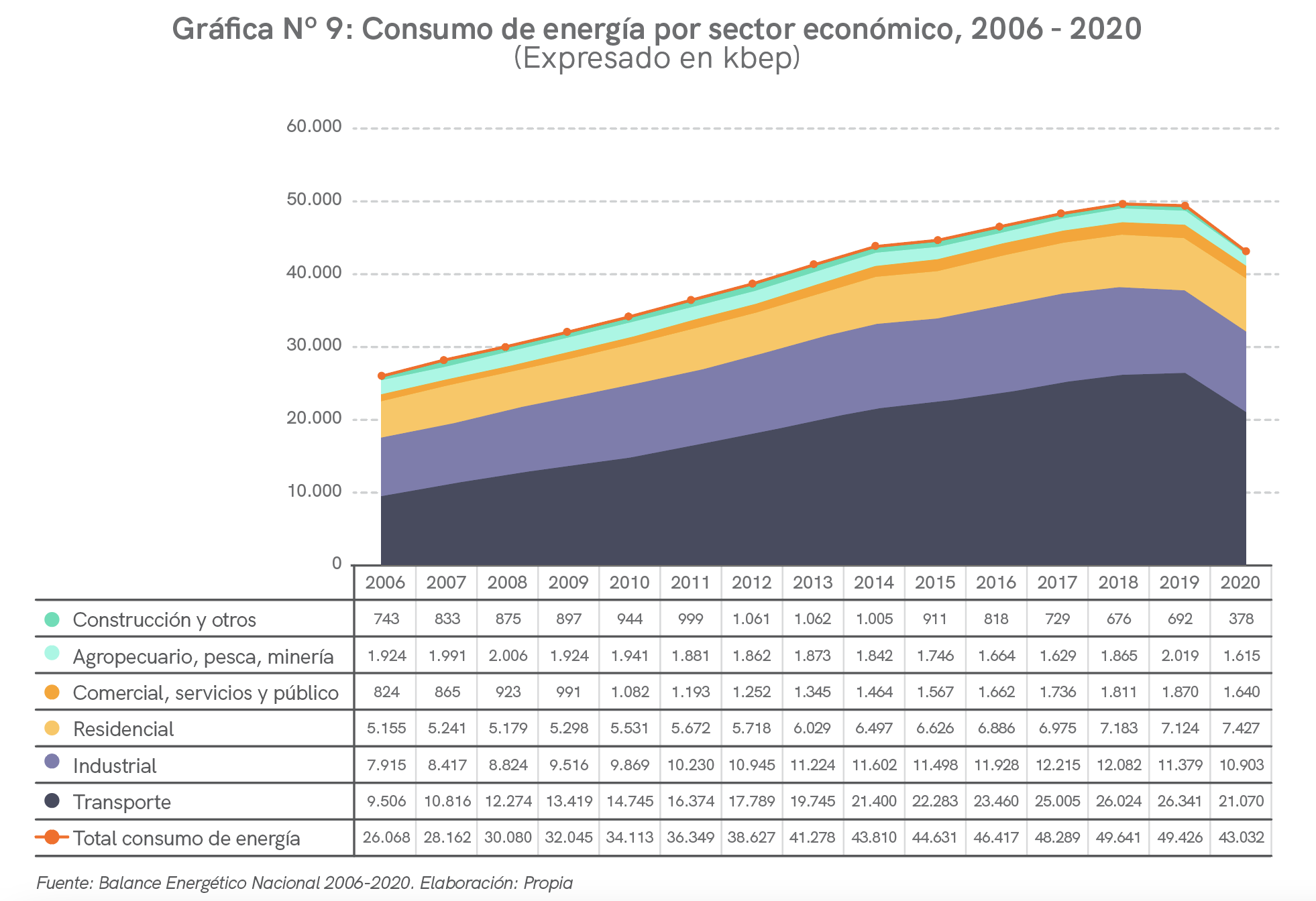 El consumo del sector transporte tuvo un crecimiento constante, de 9.5 mil kbep en 2006 a más de 26.3 mil kbep el 2019. El grueso de la energía que utiliza el transporte es diésel oil, gasolina especial, y en menor medida gas natural. Este sector tuvo un decrecimiento el 2020 por la pandemia. El otro sector con un importante incremento fue el industrial, que consume principalmente gas natural, biomasa y en menor proporción electricidad. Este sector pasó de casi 8 mil kbep en 2006 a 11.3 mil kbep el 2019. El tercer sector relevante es el residencial, que consume GLP, electricidad y biomasa, y que creció de 5.1 mil kbep a 7.4 mil kbep el 2020 (Gráfica Nº 9).