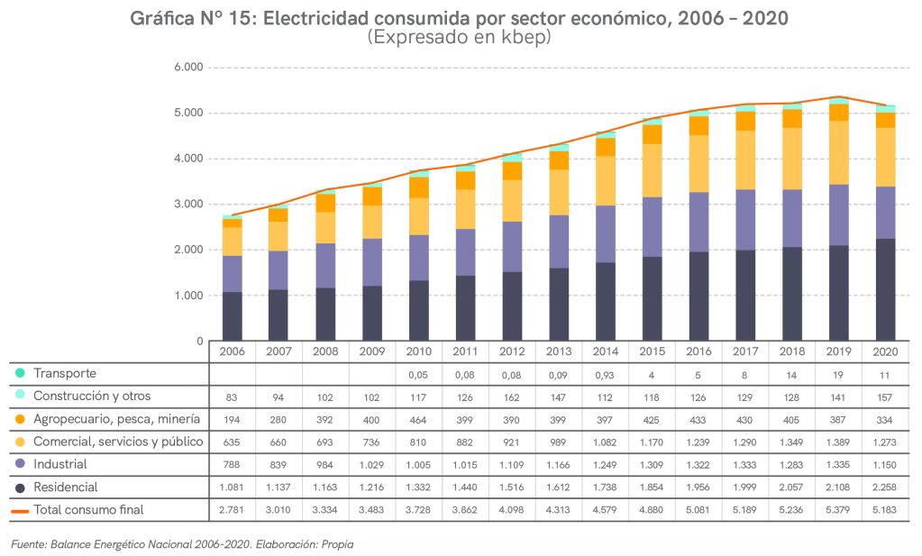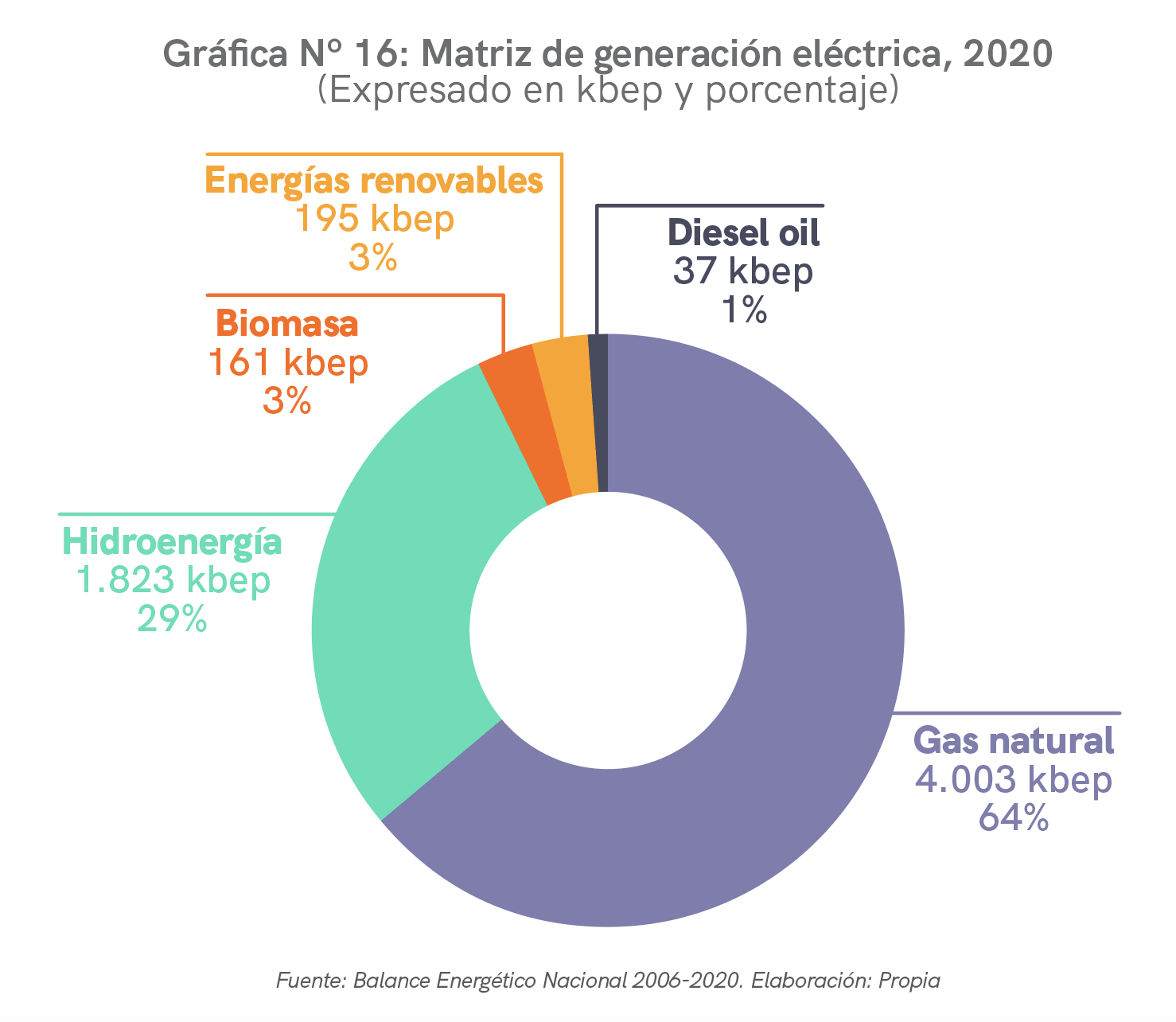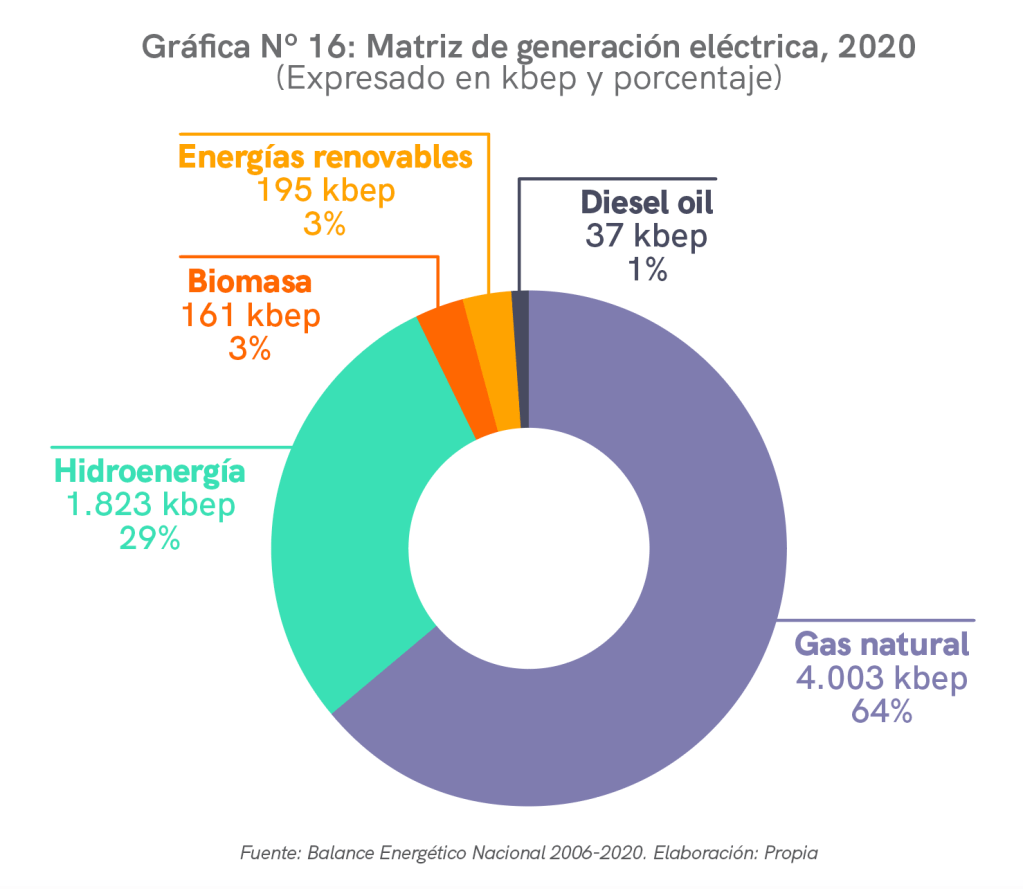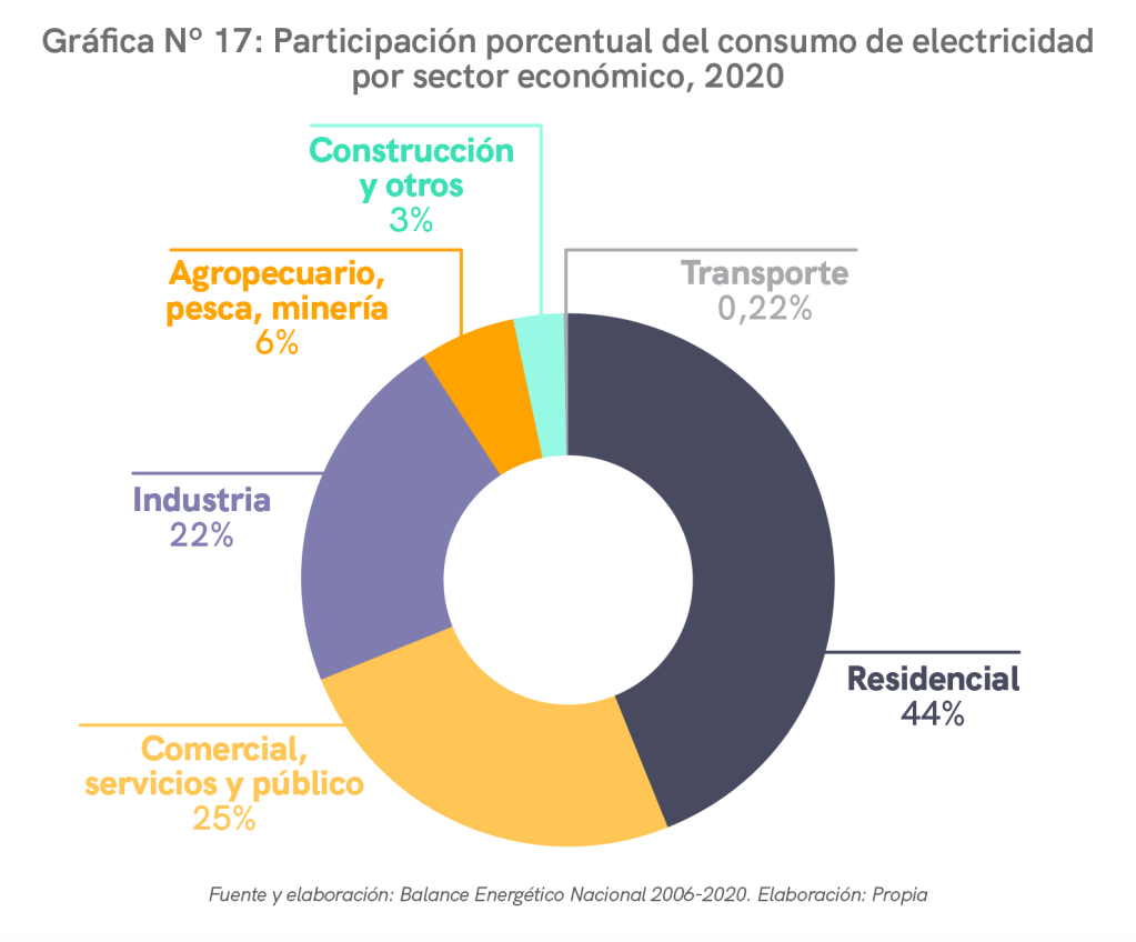 En 2020, las centrales eléctricas y autoproductores produjeron 6.2 mil kbep, con un 64% de gas natural, un 29% de hidroenergía, un 3% de energías alternativas (eólica y solar) y un 3% de biomasa (Gráfica Nº 16). El consumo de electricidad por sector económico, el 2020, tuvo al sector residencial en primer lugar con el 44%, seguido del sector comercial, servicios y público con 25%, la industria 22%, el sector agropecuario, pesca y minería con 6%, la construcción y otros con 3% y el transporte con el 0,22% (Gráfica Nº 17).