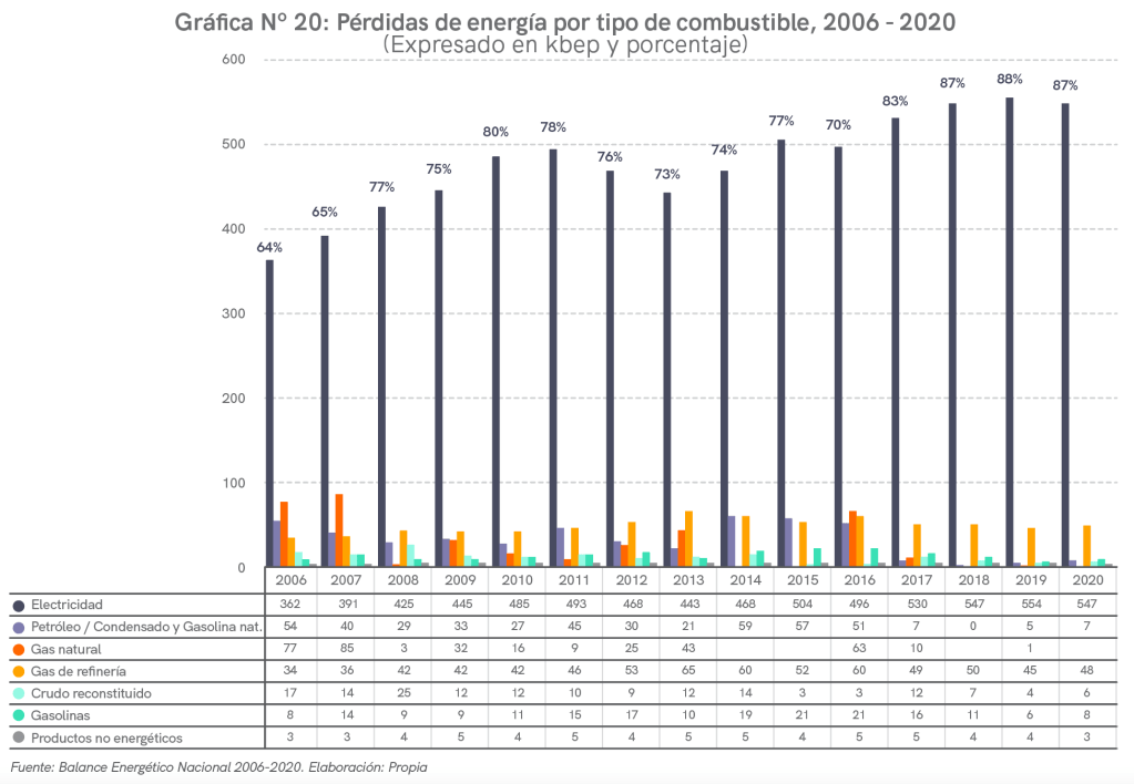 Las pérdidas no son objeto de este análisis, pero llama fuertemente la atención por su magnitud. En los últimos años fue de un 99% en la producción de la energía secundaria, creció de 437 kbep el 2006 a 620 kbep el 2020 (Gráfica Nº 19). Las pérdidas se dan sobre todo en el sector eléctrico que el 2020 alcanzó los 547 kbep cifra que representó un 87% de las pérdidas totales; otros combustibles con más pérdidas son el petróleo condensado y el gas de refinería. Para el gas natural, las pérdidas fueron disminuyendo hasta cero el 2020 (Gráfica Nº 20).