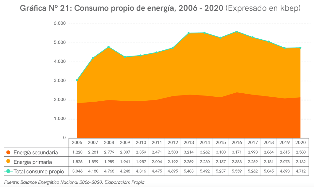 El consumo propio es la cantidad de energía primaria y secundaria que el propio sector energético utiliza para su funcionamiento en las etapas de producción, transformación, transporte, distribución y almacenamiento. Según el Balance Energético Nacional, el consumo propio también es significativo y ha tenido un crecimiento sostenido de 3 mil kbep el 2006 a 4.712 kbep el 2020 (Gráfica Nº 21).