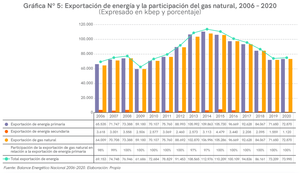 Alrededor de dos tercios de la producción total de energía primaria sale a los mercados de Argentina y Brasil, quedando el resto para el consumo interno. La exportación de energía en el periodo 2006 – 2020, fue casi en su totalidad de gas natural, tuvo su año pico el 2014 con casi 113 mil kbep, y a partir del 2015 fue decreciendo cada año hasta los 73.9 mil kbep el 2020, cifra inferior a la del año 2007 (Gráfica Nº 5). El 2020, la venta de gas natural al exterior representó el 100% de la energía primaria exportada y el 98,5% del total exportado, el gas licuado de petróleo (GLP) solo un 1% vendido principalmente a Paraguay y Perú, y el crudo reconstituido un 0,33%.