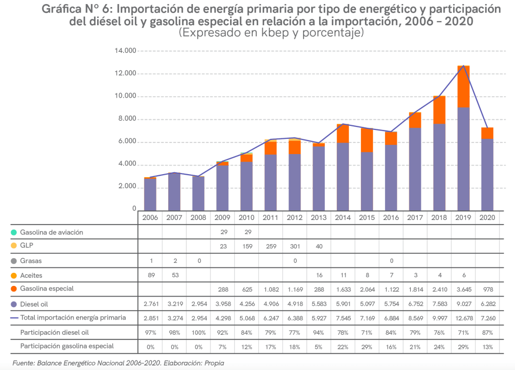 Por otra parte, la importación de energía creció considerablemente durante este periodo hasta llegar a los 12.678 kbep el año 2019 y 7.260 kbep el 2020. Se importa principalmente diésel oil, que es uno de los combustibles más consumidos por el sector transporte. La importación de diésel oil creció más de tres veces, de 2.761 kbep el 2006 a más de 9 mil kbep el 2019 y 6.282 kbep el 2020. En segundo lugar, está la gasolina especial que creció doce veces, pasando de 288 kbep el 2009 a 3.645 kbep el 2019. El 2020, la importación de diésel oil representó el 87% y la gasolina especial 13% (Gráfica Nº 6).
