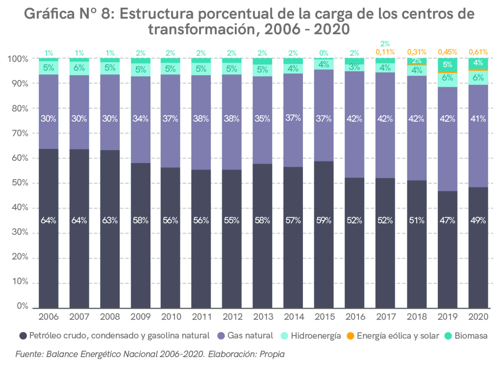 Según los datos del 2020, las refinerías transformaron el 48% de la carga total destinada a los centros de transformación y las centrales eléctricas y autoproductores el 40%, de las cuales el mayor porcentaje corresponde a las termoeléctricas, seguida de las hidroeléctricas, biomasa y en porcentajes muy bajos la eólica, solar y el diésel oil (Cuadro Nº 2).