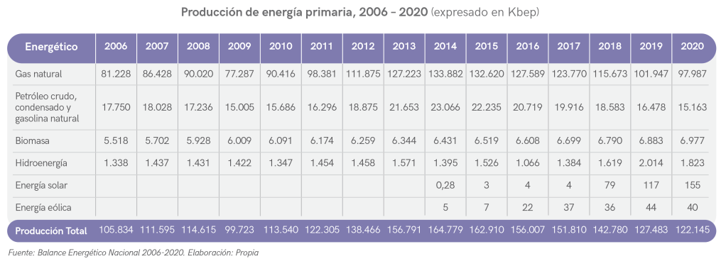 La producción de energía primaria en el periodo 2006 – 2020, creció de 105.834 Kbep el año 2006 a 164.779 Kbep el año 2014, para luego decrecer a 122.145 Kbep en 2020. A lo largo de este período la principal fuente de energía primaria fue el gas natural con una participación porcentual que fluctuó entre el 76% y el 80%.