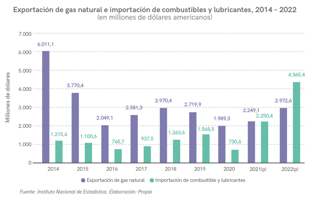 Recientes datos del INE5 indican que las exportaciones del gas natural alcanzaron su máximo en 2014 con un valor de USD 6.011 millones, para luego disminuir a USD 2.249 millones en 2021, recuperando el 2022 a USD 2.972,6 millones, un incremento del 31% en relación al 2021. Por otra parte, las importaciones de combustibles y lubricantes (principalmente gasolina especial y diesel) crecieron de USD 1.215,6 millones en 2014 a USD 2.250,4 millones en 2021 y USD 4.365,4 millones en 2022, dejando un saldo comercial negativo en los dos últimos años de USD -1,3 y -1.392,8 millones. Datos del INE también muestran que la producción de gas natural cayó de 22.188 millones de metros cúbicos en 2014 a 14.150 hasta noviembre del 2022.