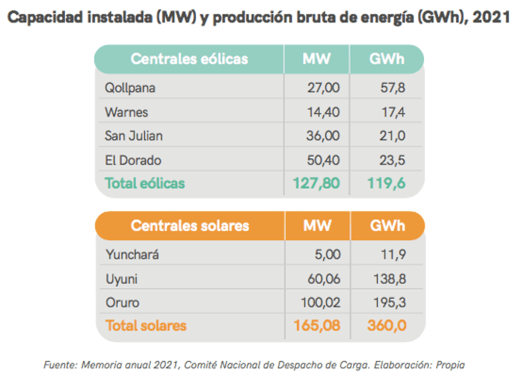 Si tomamos en cuenta sólo el subsector eléctrico, su participación en términos de capacidad instalada para 2021 fue de 3,56% para las centrales eólicas y 4,6% para las centrales solares. A nivel de generación eléctrica su participación en el subsector eléctrico el año 2021 fue de 1,2% para las eólicas y 3,4% para las solares.