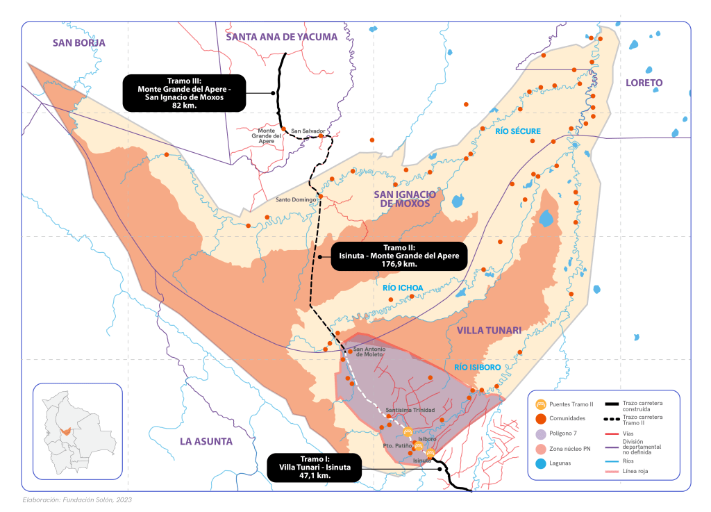 Cuando esta vía fue dividida en tres tramos para viabilizar su irregular construcción -por atravesar dos TCO y un parque nacional- tanto el tramo 1 (Villa Tunari – Isinuta) por el sur y el tramo 3 (Monte Grande del Apere – San Ignacio de Moxos) por el norte contaban con Estudio de Evaluación de Impacto Ambiental – Analítico Integral (EEIA – AI), Licencias Ambientales y Declaraciones de Impacto Ambiental, según la Petición de Informe Escrito (PIE) 890/2017-2018 del senado. El tramo 2 Isinuta – Monte Grande del Apere, que atraviesa el parque nacional y la TCO Isiboro Sécure, no cuenta con ningún estudio ni autorización legal, según la Evaluación Estratégica Ambiental (Rumbol; Sernap, 2011).
