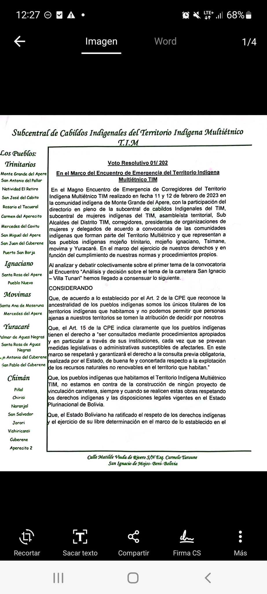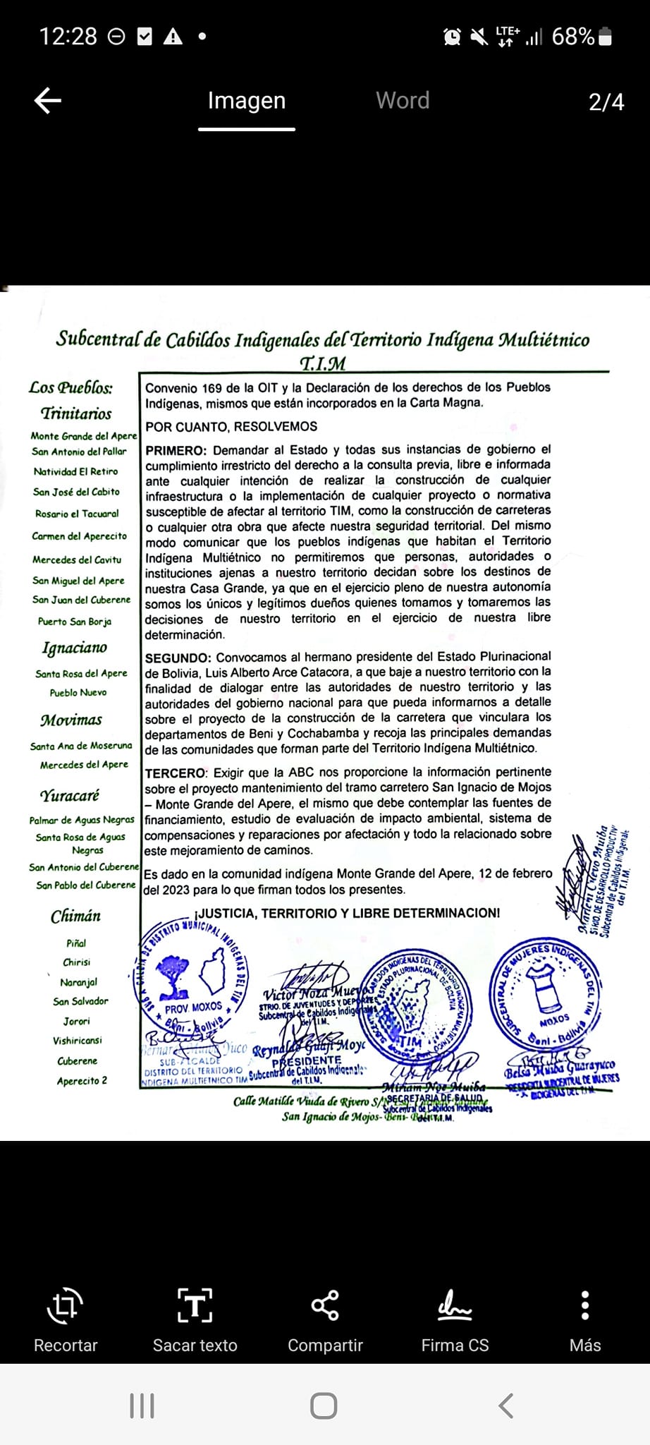 En una tensa asamblea de emergencia en la comunidad Monte Grande del Apere del TIM el pasado 11 y 12 de febrero de 2023, delegados mojeño ignacianos, mojeño trinitarios, tsimanes, movimas y yuracarés se sentaron a analizar y debatir acerca del tramo que atraviesa su territorio. Finalmente, el Voto Resolutivo 01/2023 demandó al gobierno el cumplimento del derecho a la consulta previa, libre e informada; convocar al presidente Luis Arce para informar sobre el proyecto en ese territorio; y que la ABC informe sobre el mantenimiento del tramo San Ignacio de Moxos – Monte Grande del Apere: fuentes de financiamiento, Estudio de Evaluación de Impacto Ambiental (EEIA), “sistema de compensaciones y reparaciones por afectación”.