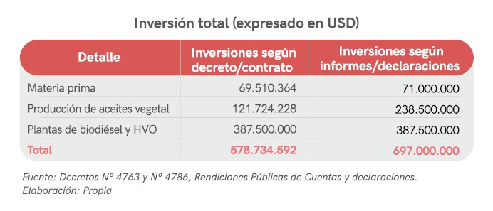 La inversión total para la planta de diésel renovable inicialmente era de 250 millones de dólares[4], posteriormente se especificó que las inversiones en la sustitución de importaciones de diésel son: planta HVO 317 millones de dólares, la planta de biodiésel 66 millones de dólares y la planta de diésel sintético 46 millones de dólares, haciendo un total de 429 millones de dólares)[5]. Finalmente, el contrato con YPFB Refinación para las Planta de Biodiésel I, Planta de Biodiésel II y la Planta de Diésel Renovable (HVO) son por un monto Bs 2.697 millones, unos 387,5 millones de dólares[6], de los cuales 80 millones de dólares son para las plantas de biodiésel.