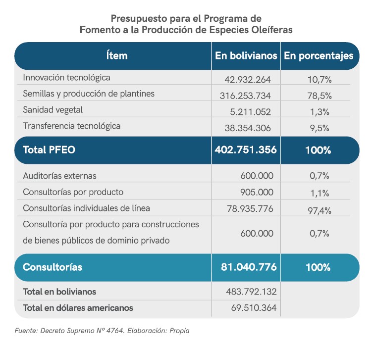 El Programa de Fomento a la Producción de Especies Oleíferas (PFEO) cuenta con una transferencia de Bs 402.751.356 (USD 57.866.574) (Art. 3) del Tesoro General de la Nación y el incremento del presupuesto para consultorías hasta Bs 81.040.776 (USD 11.643.789) (Art. 5). Conforme el Anexo I de este Decreto, un 78,5% de lo presupuestado, se destinará a la compra de semillas y producción de plantines de especies oleíferas y el 20% del presupuesto se destina a la innovación y transferencia tecnológica. Con relación a las consultorías más del 97%, cerca de Bs 79 millones, serán destinados a consultorías individuales de línea: