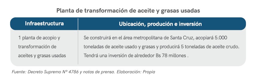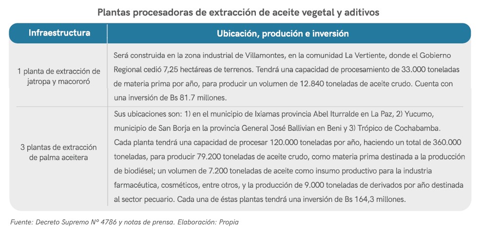 Para iniciar la oferta de la materia prima, el gobierno promulgó el Decreto Supremo Nº 4764 del 20 de julio de 2022 por el que se crea el “Programa de Fomento a la Producción de Especies Oleíferas” (Art. 1) con el objetivo de “implementar condiciones técnicas y tecnológicas para el desarrollo de cultivos y de la base productiva de especies oleíferas, impulsando en zonas potenciales las capacidades de los productores locales con el manejo sostenible del cultivo en términos económicos, ambientales y sociales”. Este programa es ejecutado por el Instituto Nacional de Innovación Agropecuaria y Forestal (INIAF), dependiente del Ministerio de Desarrollo Rural y Tierras, y tendrá una vigencia de 5 años, del 2022 al 2026 (Art. 2).