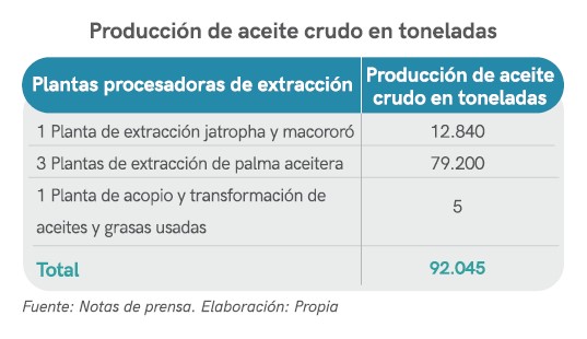 Conforme a la información del gobierno, una vez que entren en operación las ocho plantas producirán 110.044 toneladas año de aceite crudo[31], pero, en base a los datos tomados por la prensa, solo se llegaría a 92 mil toneladas: