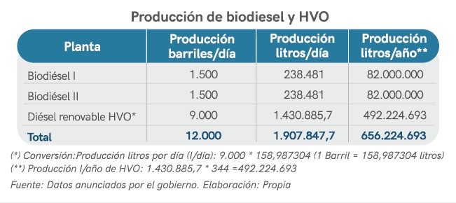 De acuerdo a los datos dados por las autoridades responsables, las plantas de biodiésel producirán cada una, 1.500 barriles por día y la planta de HVO, 9.000 barriles por día, lo que hace un total de las tres plantas de 12 mil barriles de combustible por día. En base a estos datos, se calcula que las tres plantas producirán anualmente en litros alrededor de 656,2 millones y diariamente 1,9 millones.