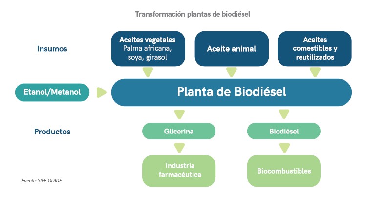 El biodiésel es un combustible líquido que se obtiene a partir de aceites vegetales, grasas de animales y aceites reciclados, mediante un proceso llamado transesterificación, que consiste en reemplazar el glicerol por un alcohol simple, como el metanol o el etanol, en ésteres metílicos o etílicos de ácidos grasos, más conocido por su sigla en inglés FAME (fatty-acid methyl ester). Como subproducto de este proceso se obtiene la glicerina.