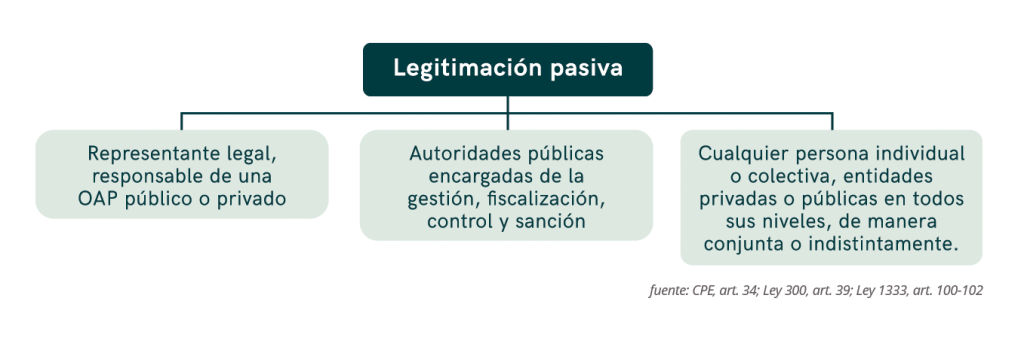 En cuanto a la legitimación pasiva, es decir, quienes son pasibles de ser demandados/as por causar daños ambientales por sus acciones u omisiones, están todas las autoridades públicas que tengan el deber de gestionar, fiscalizar, controlar y/o sancionar en temas relacionados al medio ambiente o los componentes de la Madre Tierra, los/as representantes legales de una Actividad, Obra o Proyecto (AOP) y, cualquier persona individual o colectiva de manera conjunta o indistintamente.