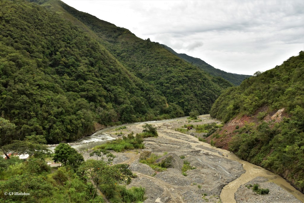 Afluente del río Yolosa (derecha) con el río Huarinilla (izquierda) y formación del río Coroico. La presencia de escombros de por la construcción de la carretera es aún notorio. El río Yolosa presenta claras señales de una importante afectación producto de las actividades mineras río arriba