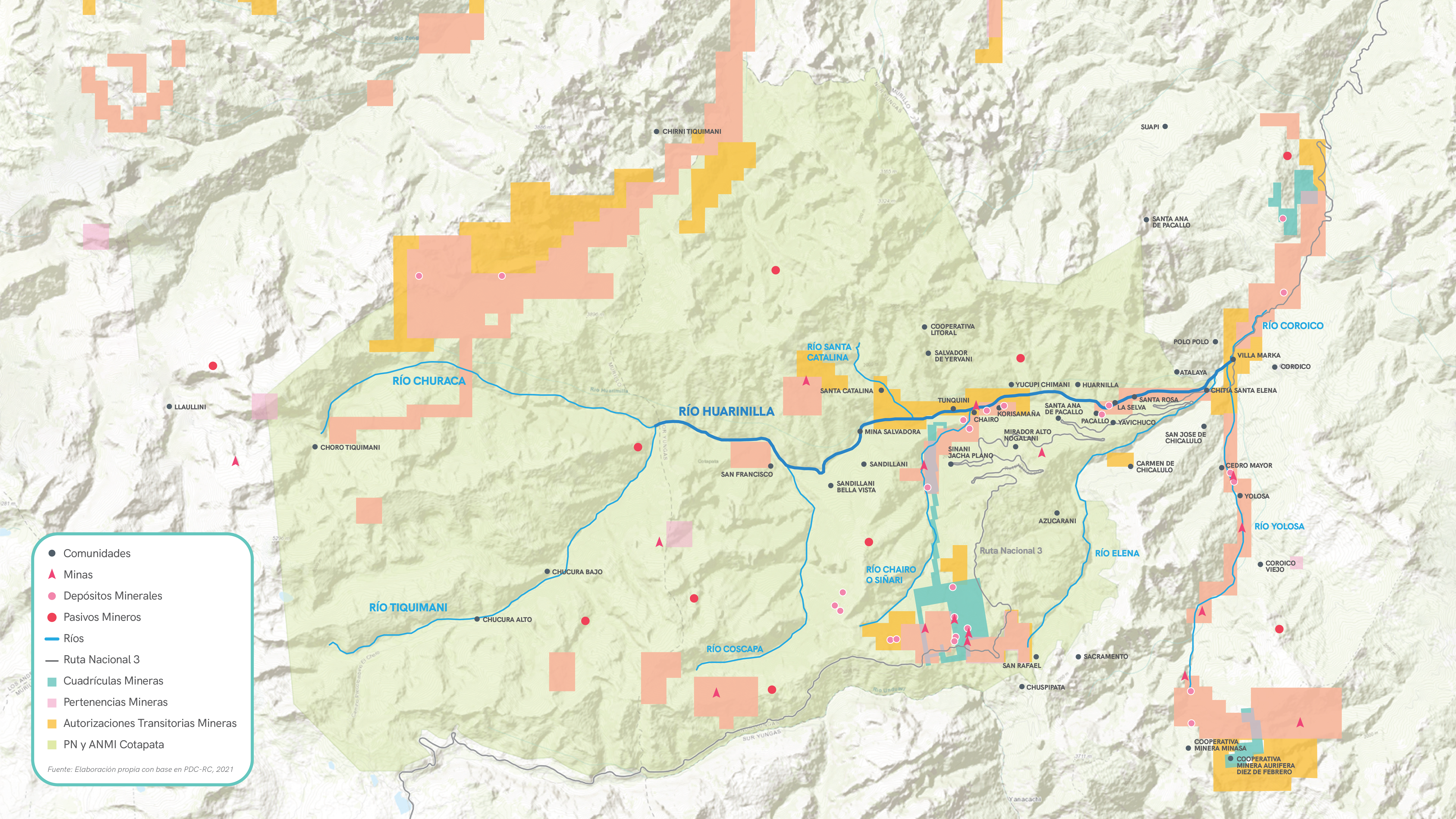 A los efectos de la carretera, se añaden otras presiones que afectan profundamente al río, así como a sus habitantes humanos y no humanos; dentro de las cuales sobresale la minería. Dentro del PN y ANMI Cotapata existen unas 18 operaciones mineras (WSC 2020). Actualmente, según el Plan Director de la cuenca del río Coroico (PDC-RC), hay unas nueve minas en toda la cuenca del río Huarinilla (además de pasivos y depósitos mineros), más otras cinco minas sobre el río Yolosa. A esto se añaden una gran cantidad de concesiones mineras sobre el mismo río Huarinilla, el río Santa Catalina, el río Chairo y Yolosa; así como las partes altas de la cuenca, sobre todo en Cotapata y en el río Tiquimani (PDC-RC 2021).